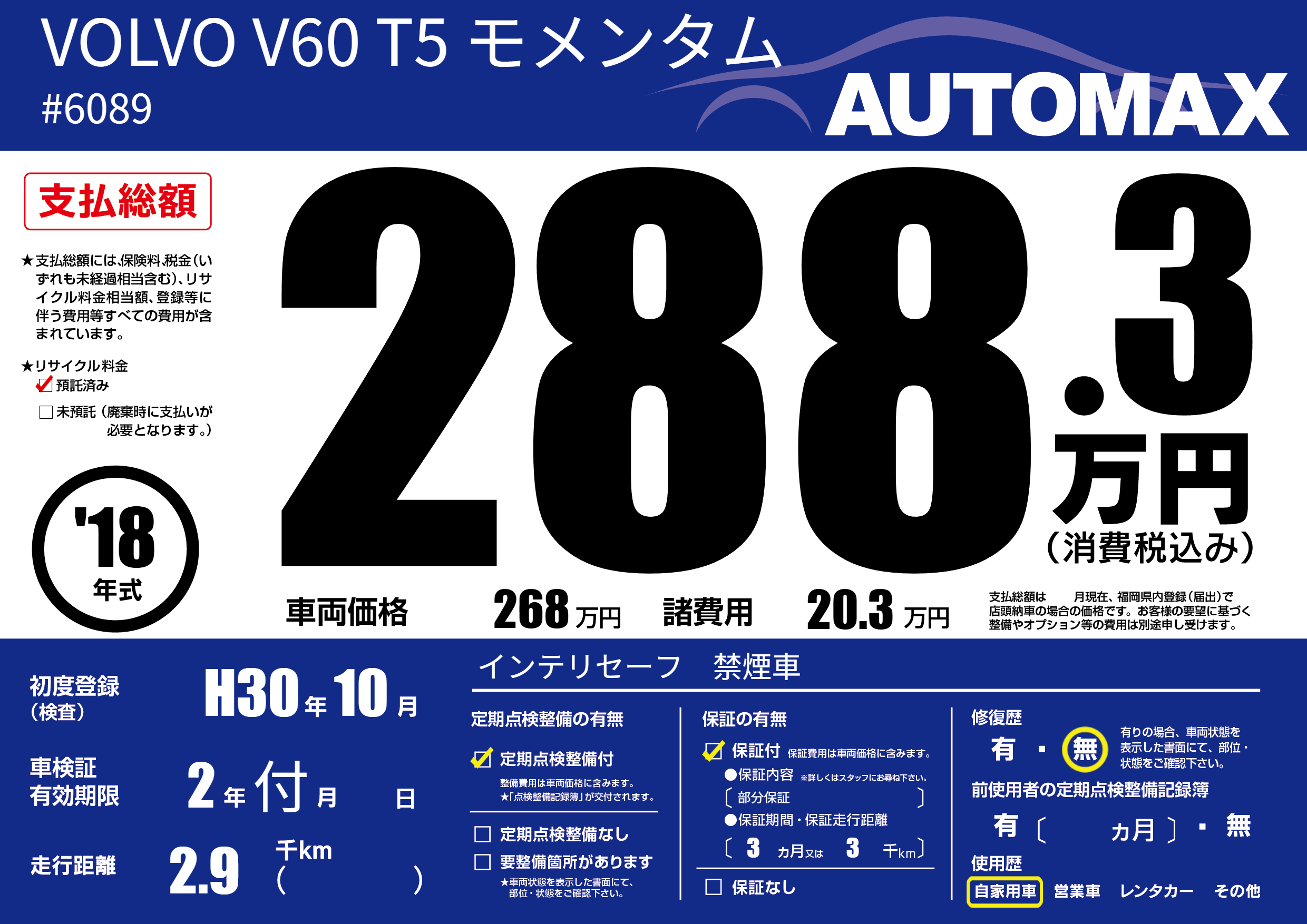| 車名 | VOLVO V60 T5 モメンタム | グレード ミッション 排気量 |