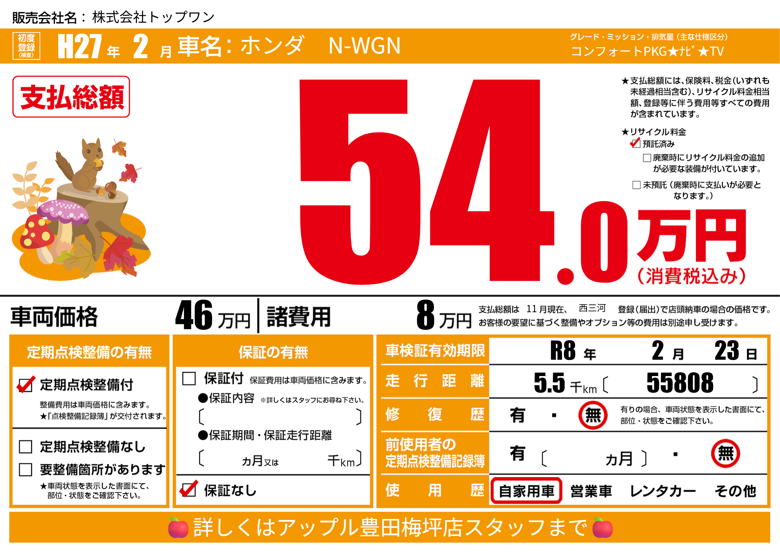 | 車名 | ホンダ N-WGN | グレード ミッション 排気量 |