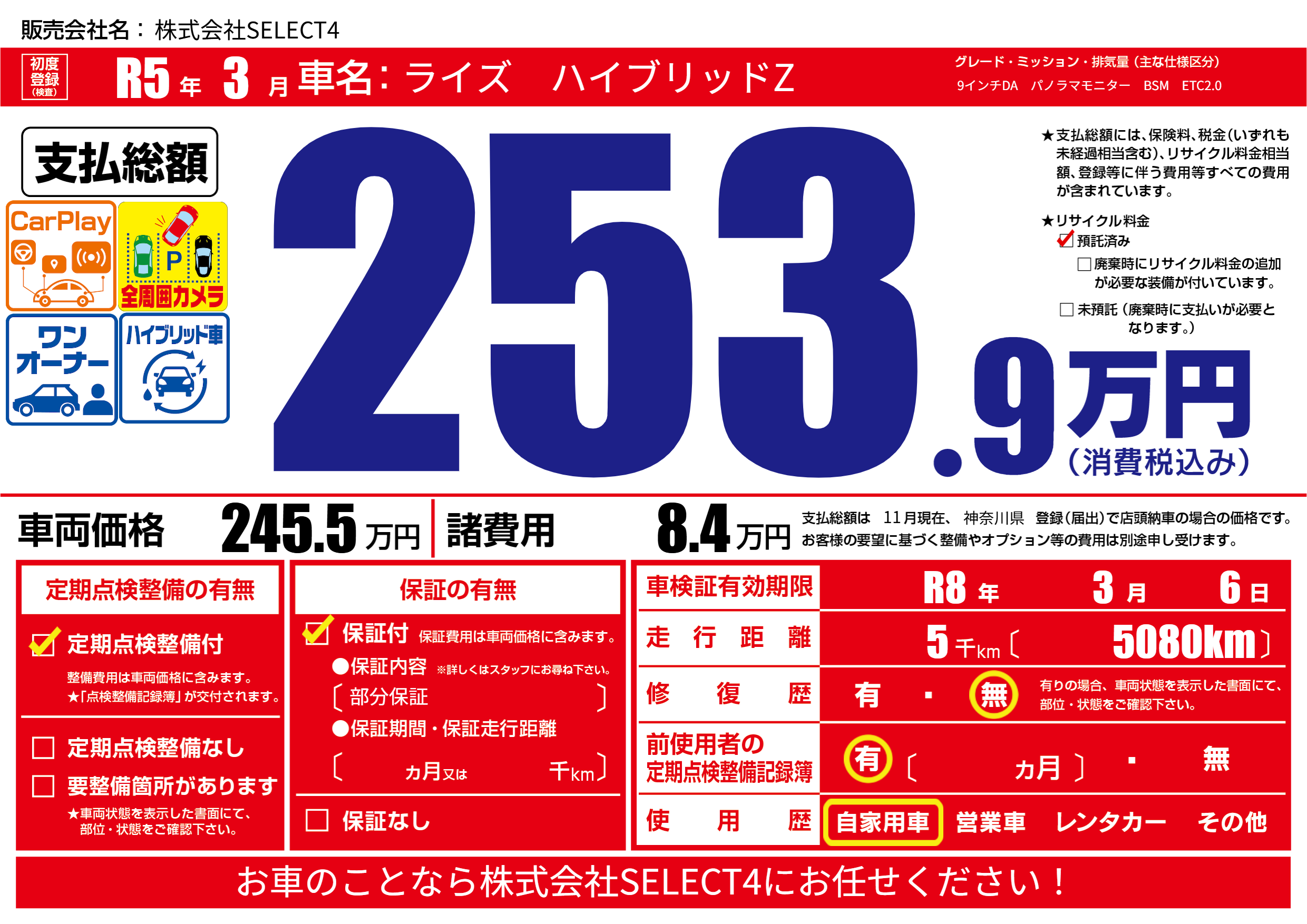 | 走行キロ | 0.5万km | 初年度登録 | R5年3月 |