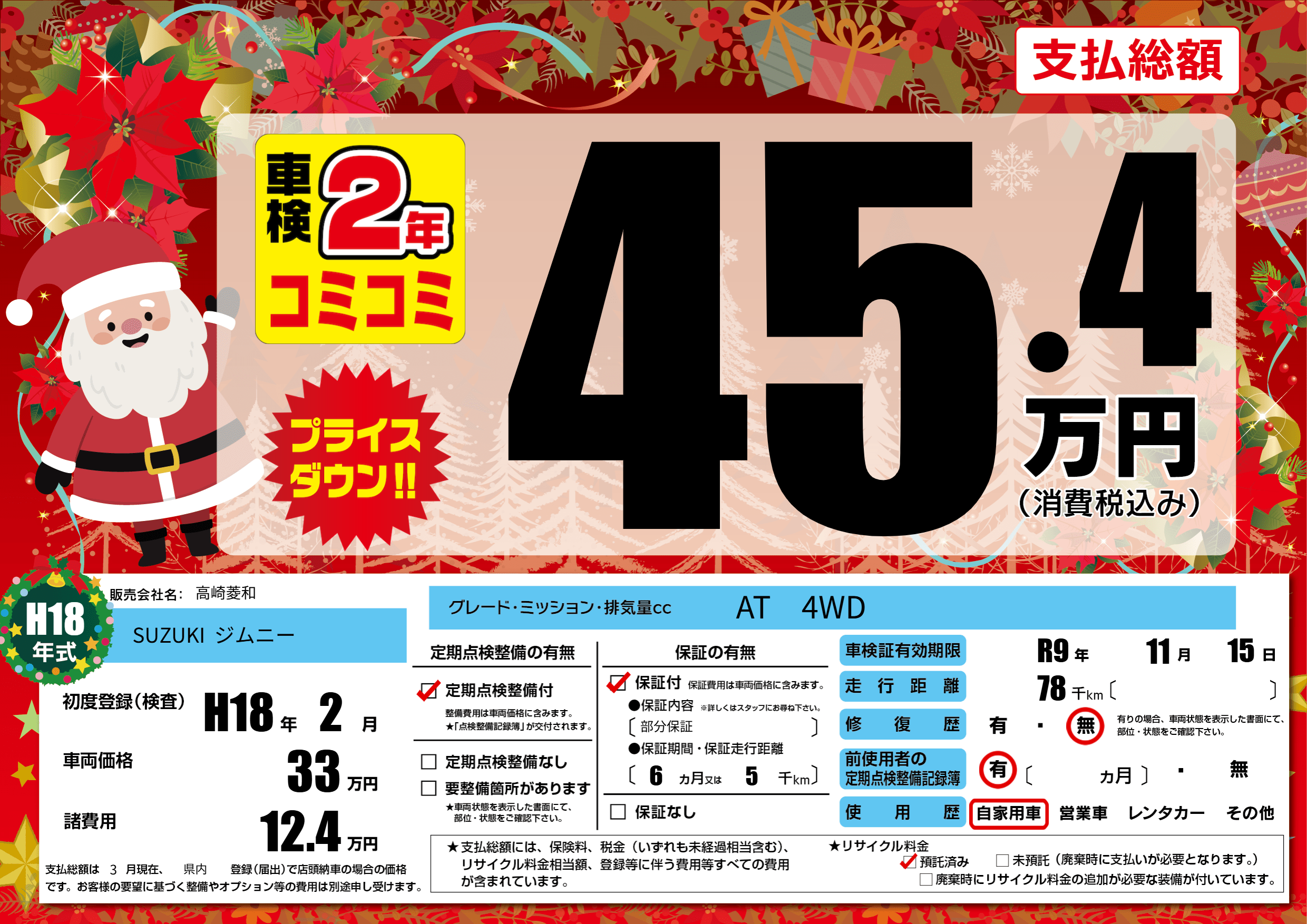| 車名 | SUZUKI ジムニー | グレード ミッション 排気量 |