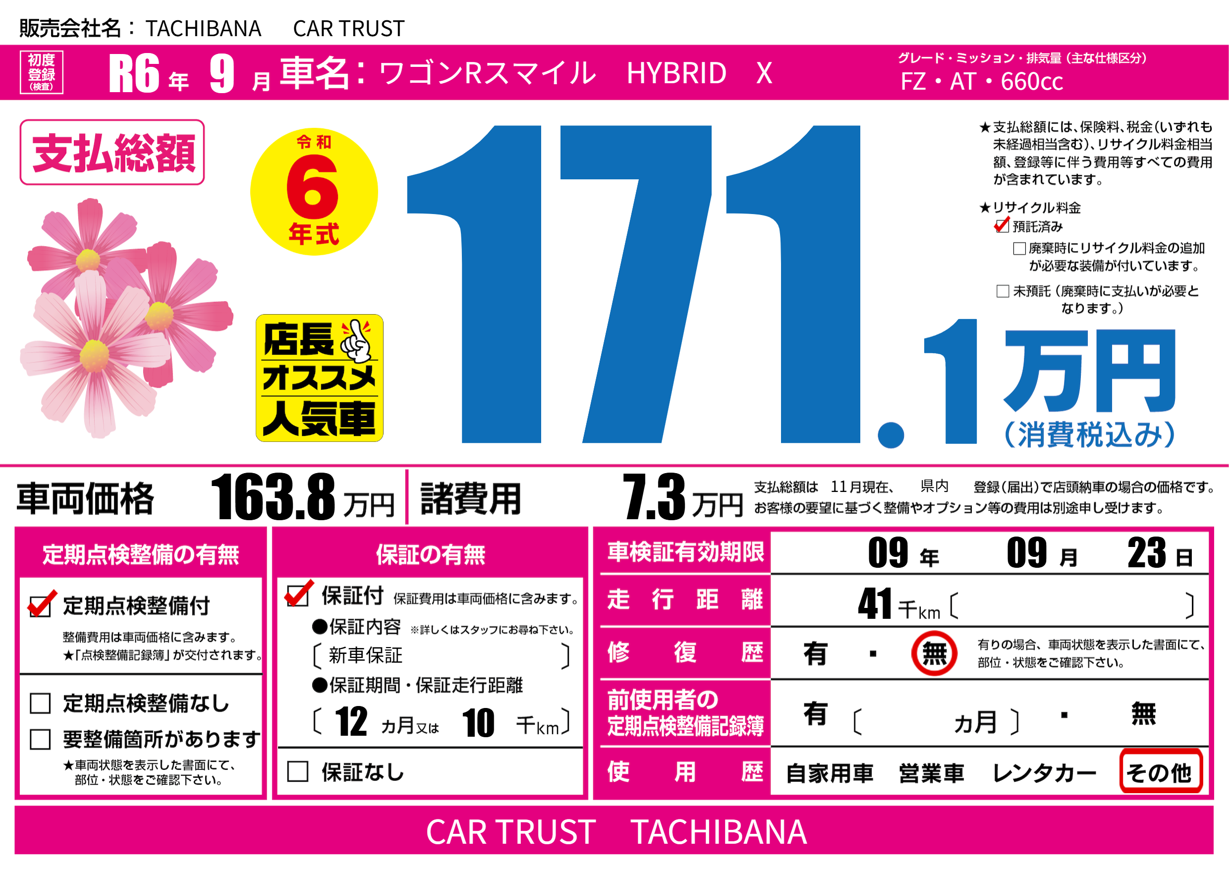 | 車名 | ワゴンRスマイル HYBRID X | グレード ミッション 排気量 |