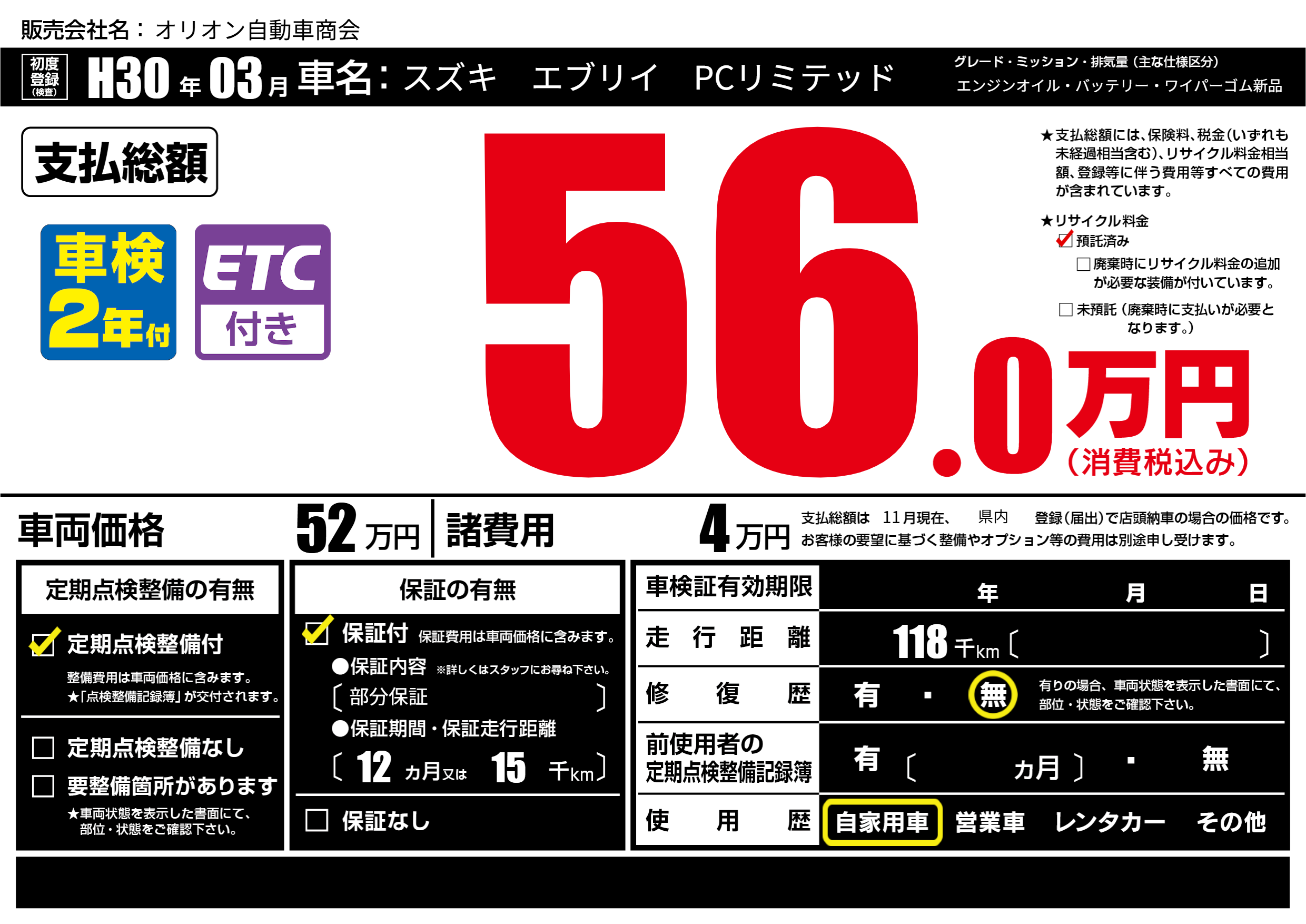 | 車名 | スズキ エブリイ PCリミテッド | グレード ミッション 排気量 |