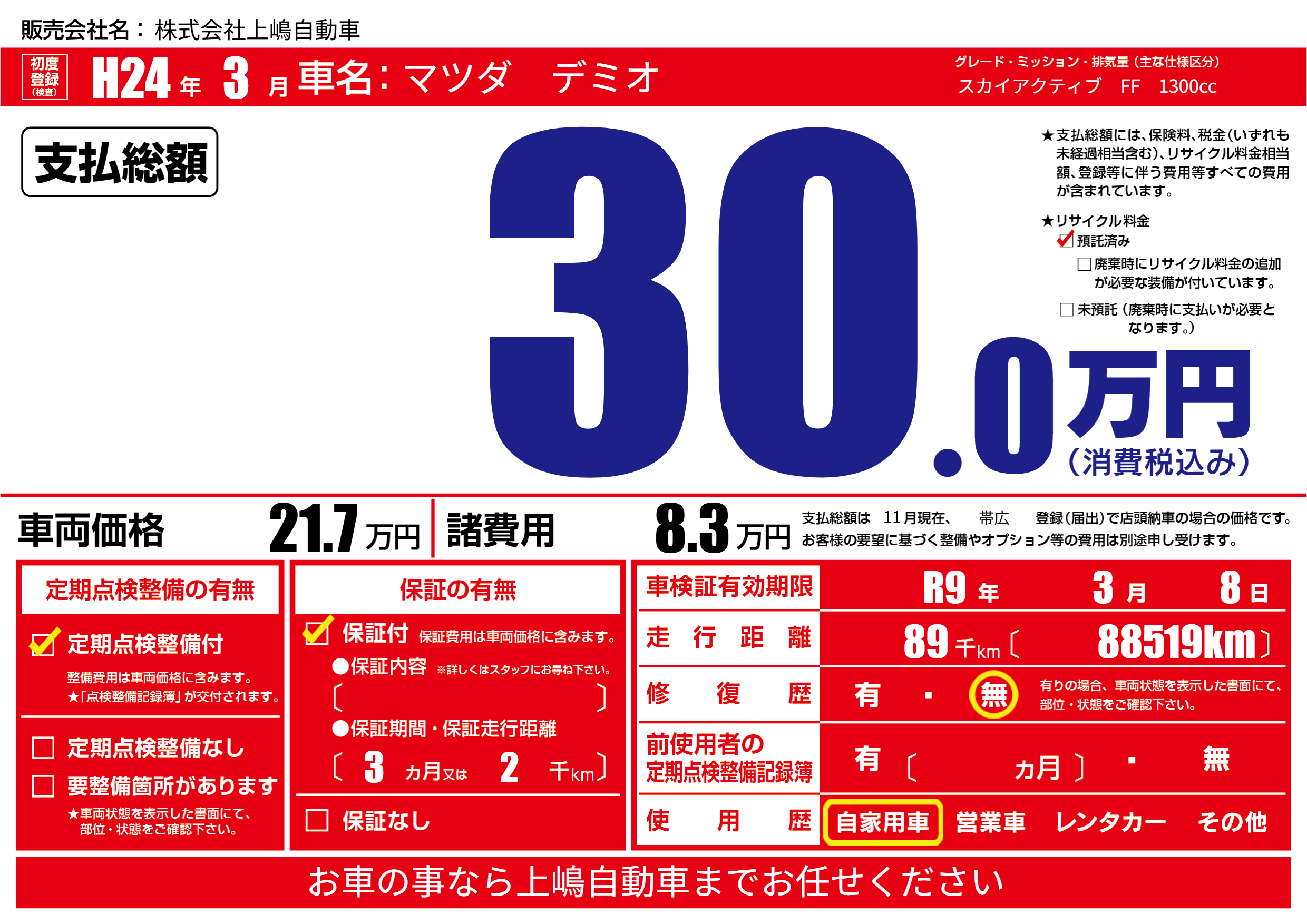 | 走行キロ | 8.9万km | 初年度登録 | H24年3月 |