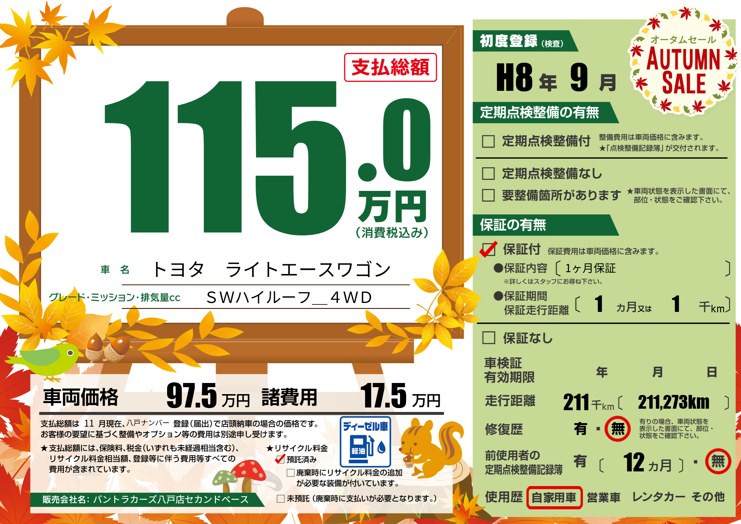 | 走行キロ | 21.1万km | 初年度登録 | H8年9月 |