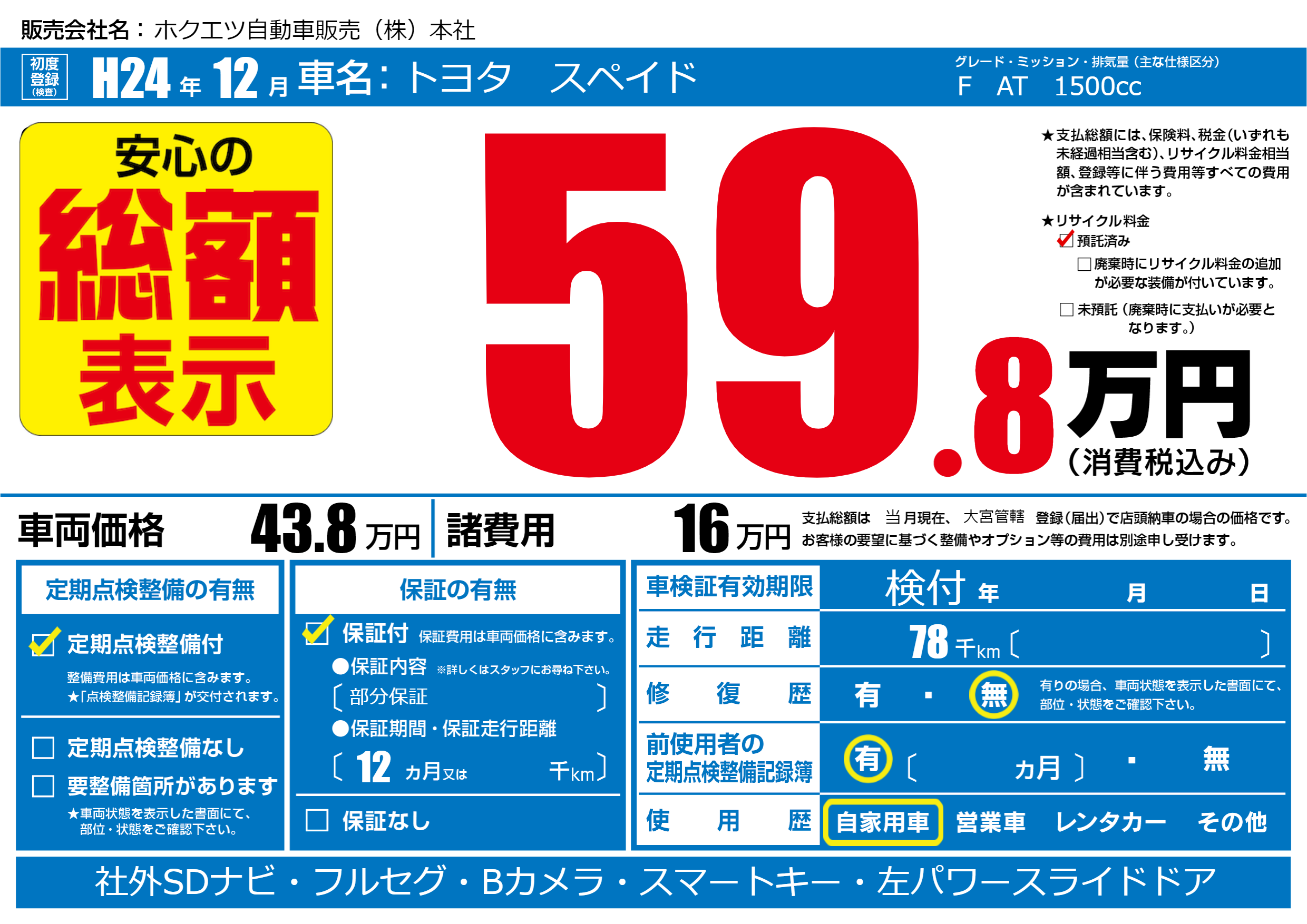 | 車名 | トヨタ スペイド | グレード ミッション 排気量 |