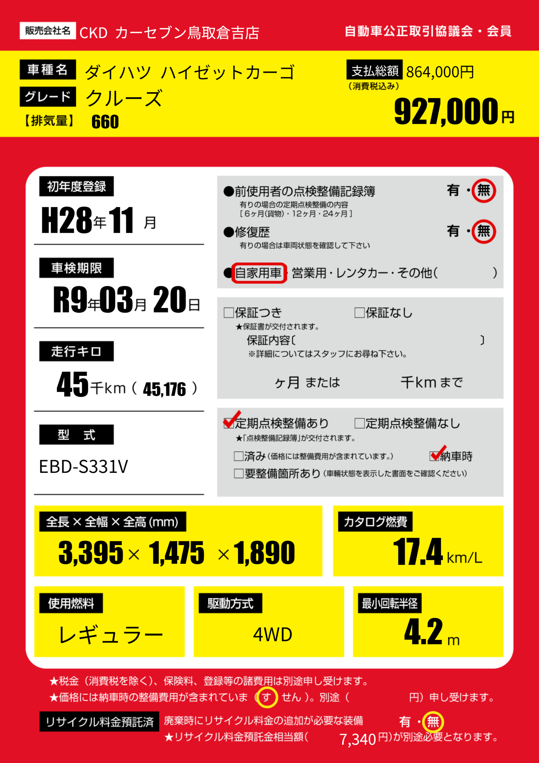 | 車名 | ダイハツ ハイゼットカーゴ | グレード ミッション 排気量 |