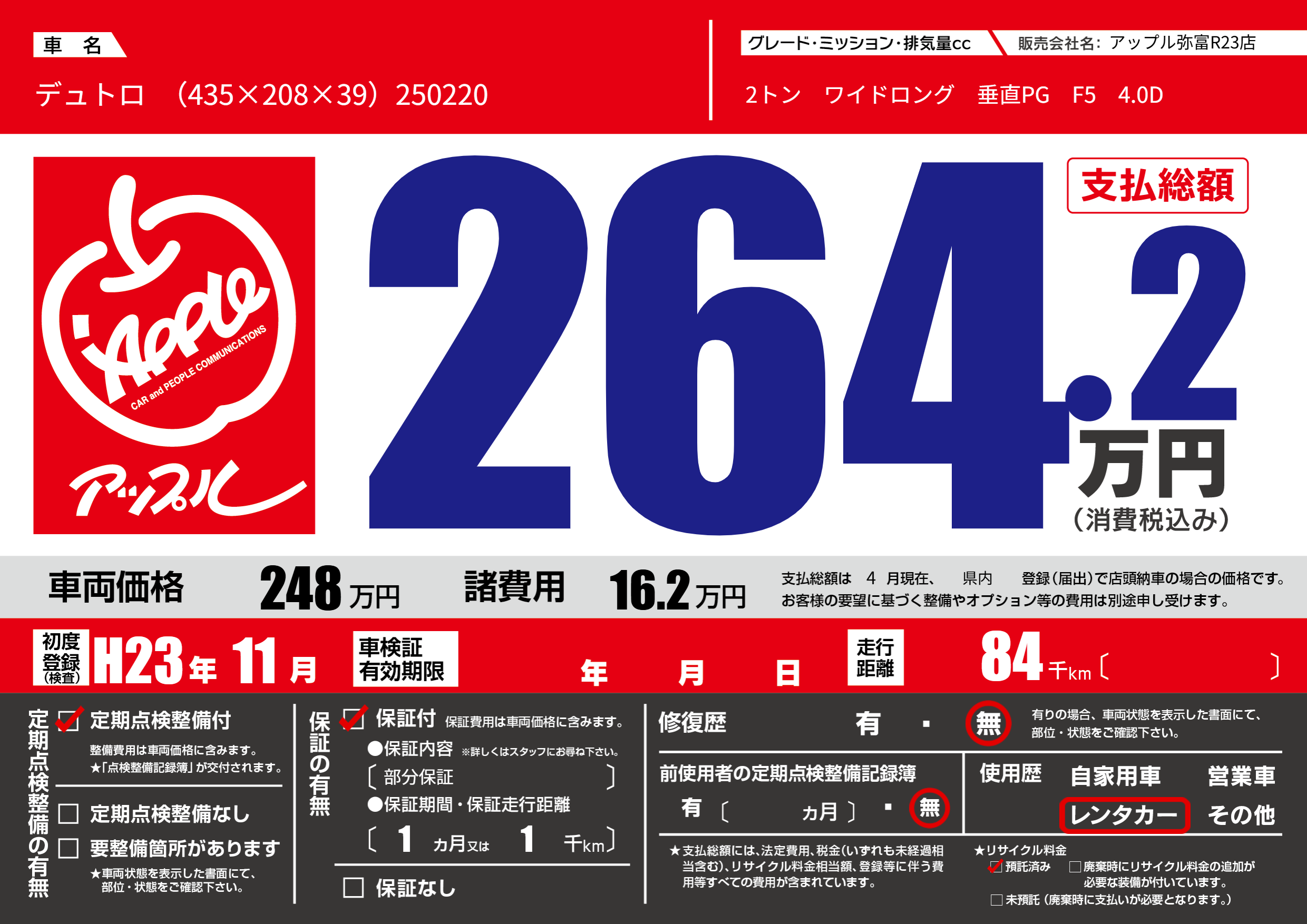 | 車名 | デュトロ (435×208×39)250220 | グレード ミッション 排気量 |
