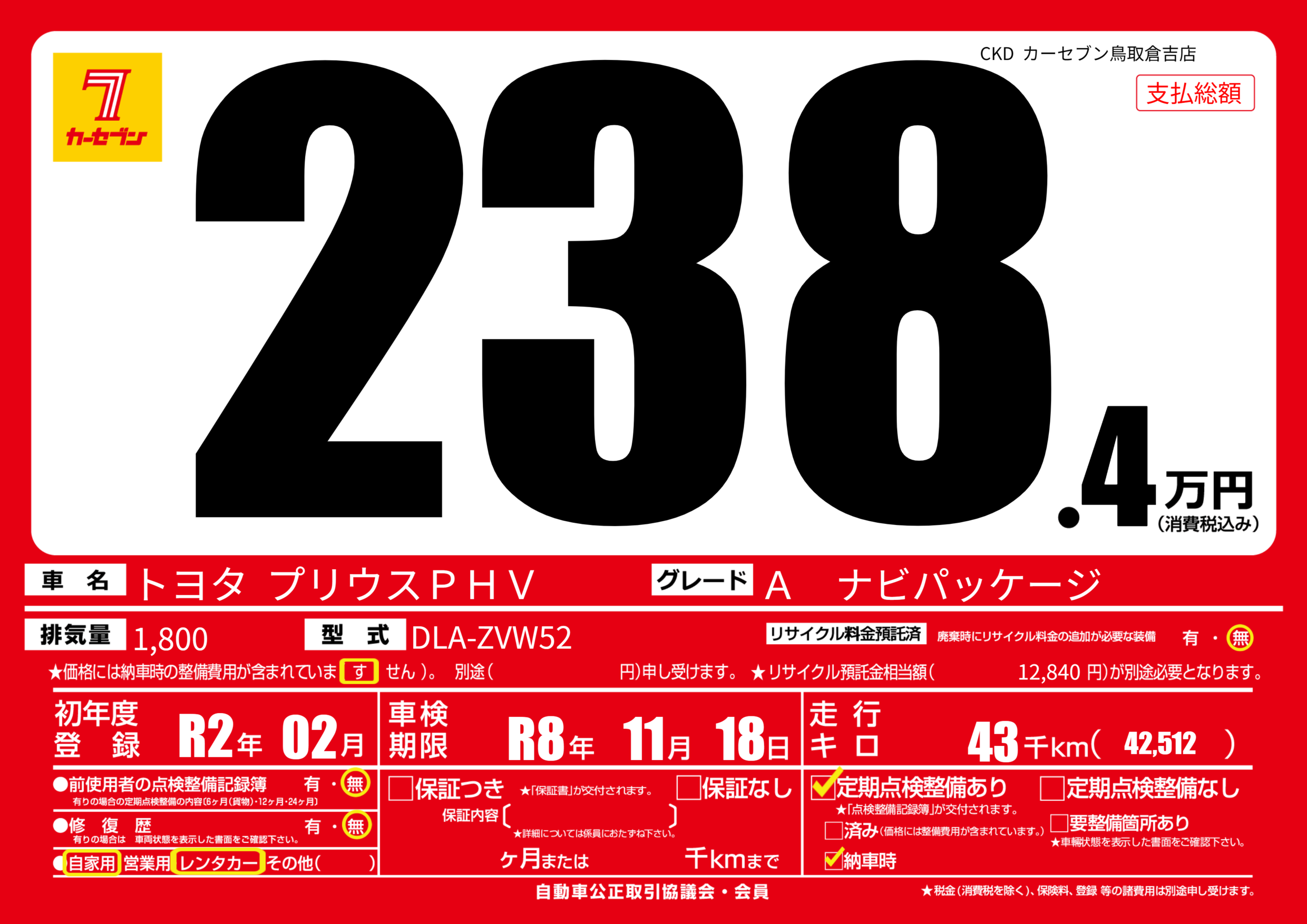 | 車名 | トヨタ プリウスPHV | グレード ミッション 排気量 |