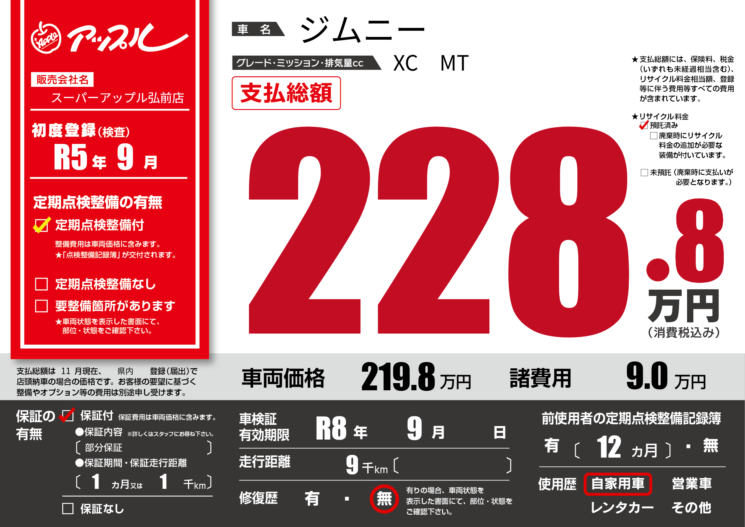 | 走行キロ | 0.9万km | 初年度登録 | R5年9月 |
