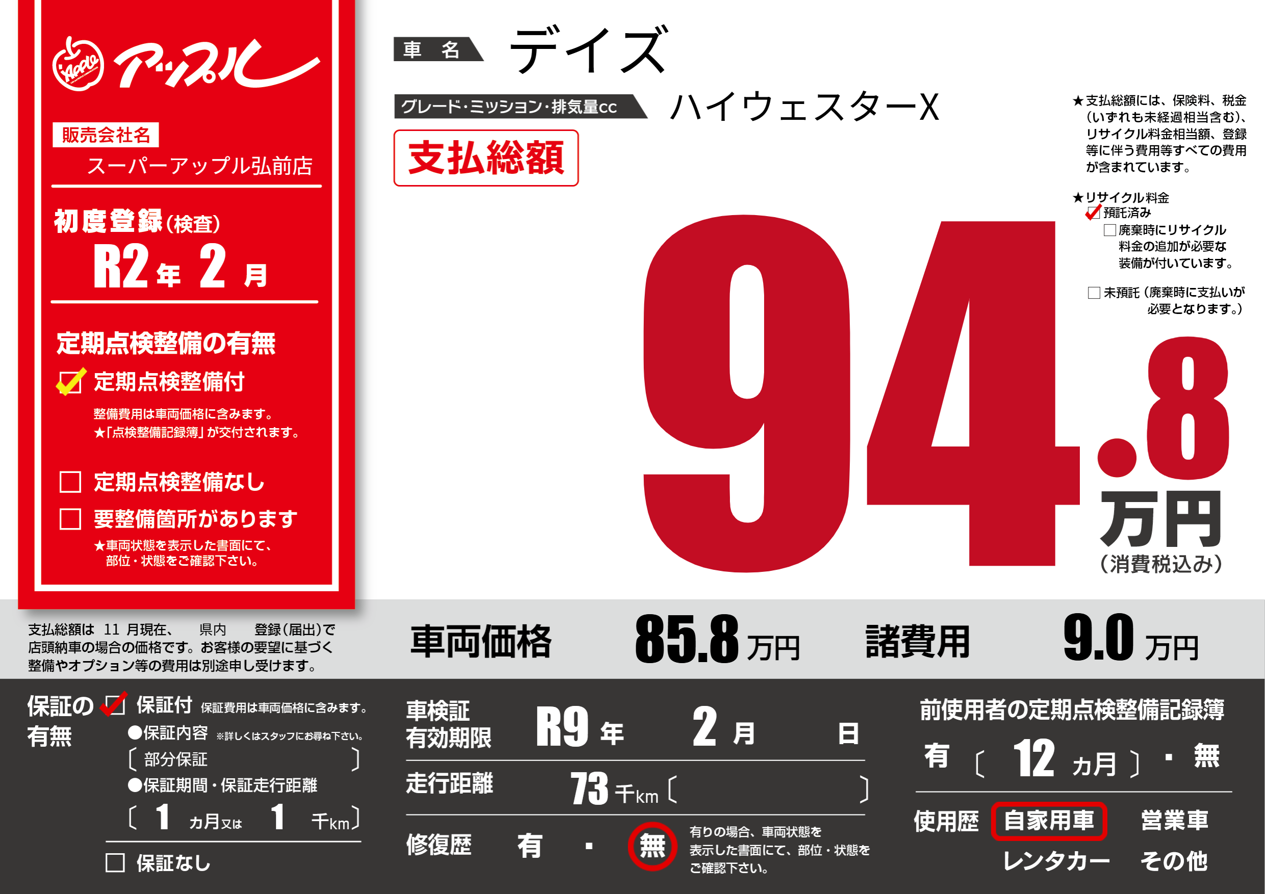 | 走行キロ | 7.3万km | 初年度登録 | R2年2月 |