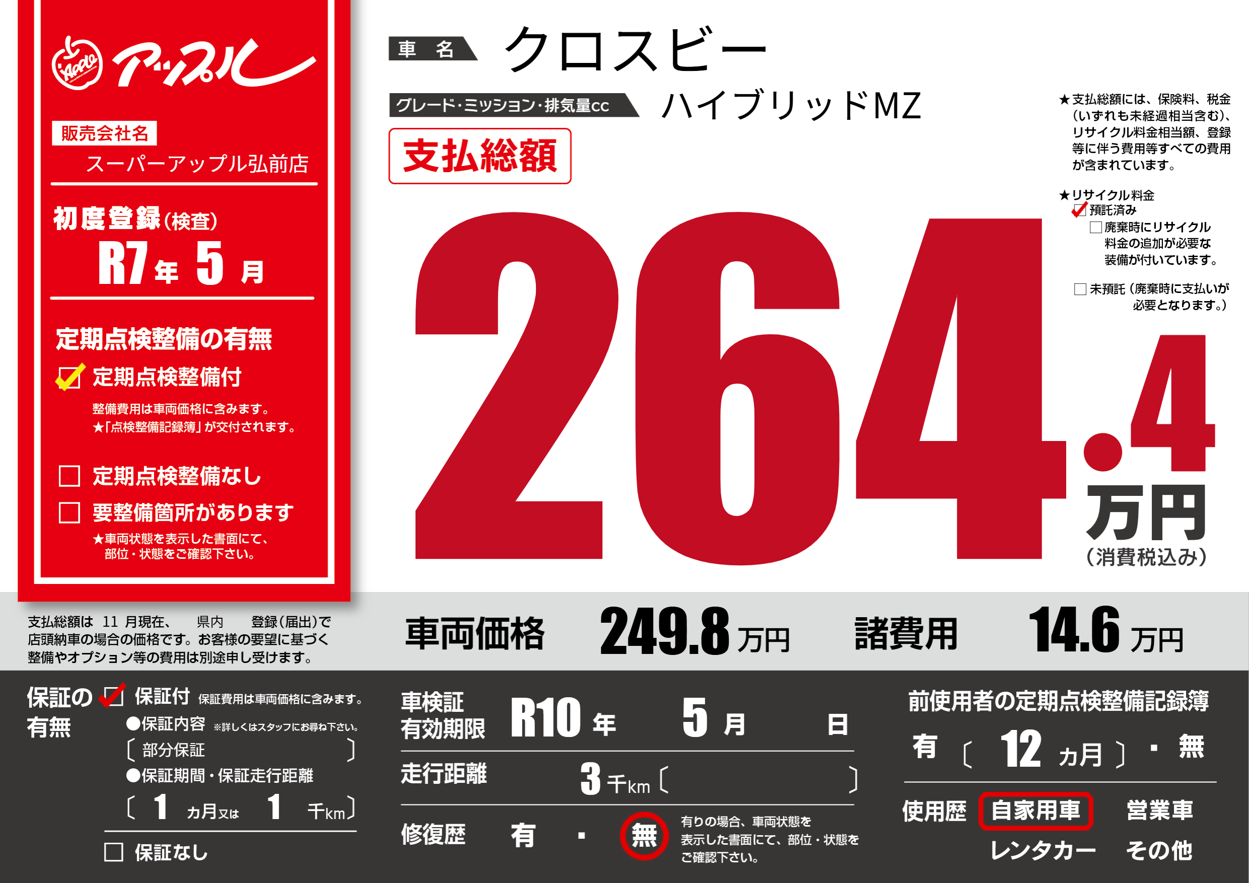 | 走行キロ | 0.3万km | 初年度登録 | R7年5月 |