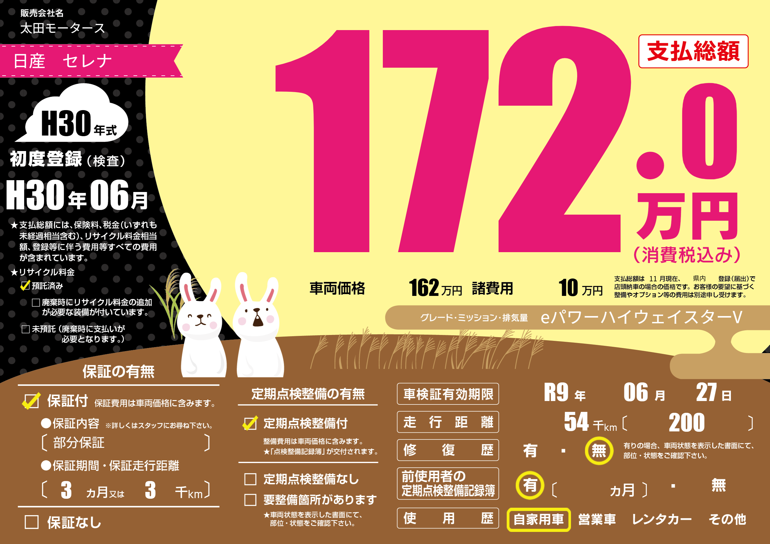 | 車名 | 日産 セレナ | グレード ミッション 排気量 |