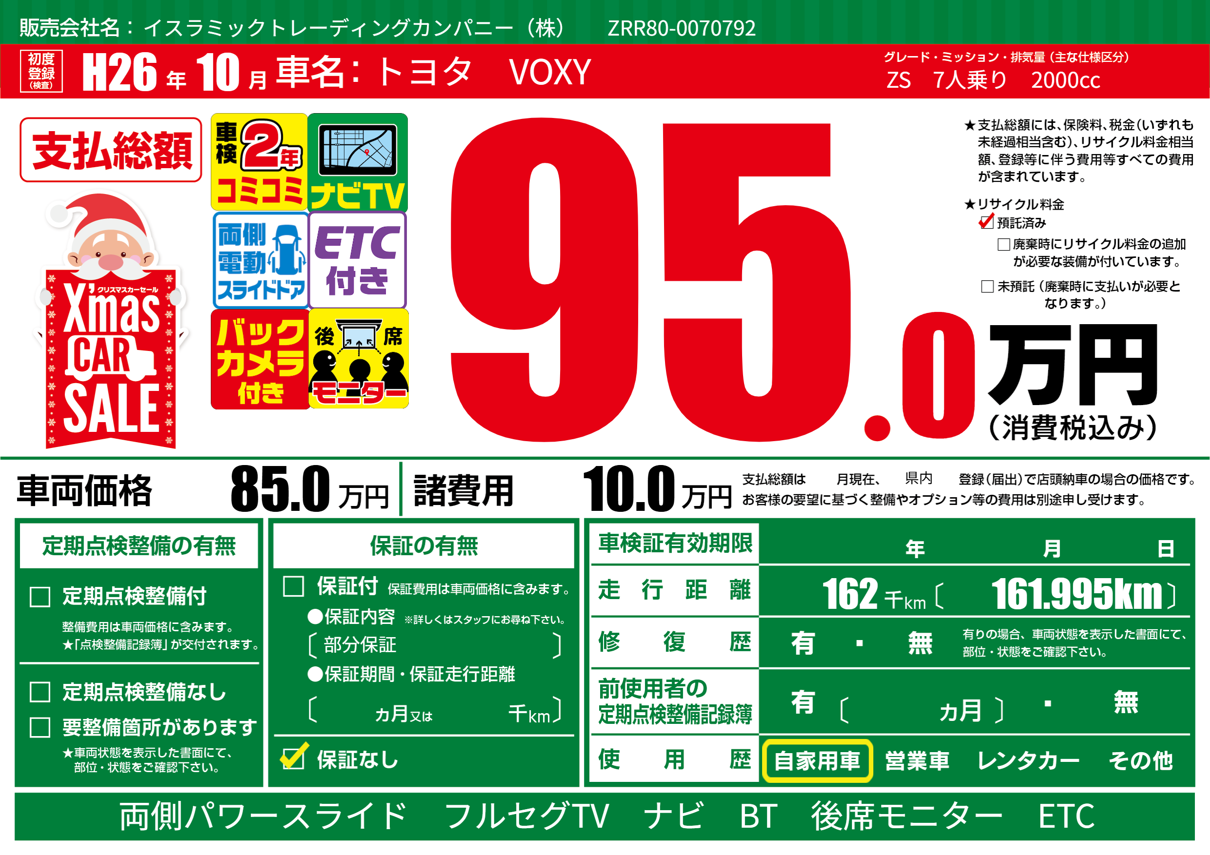 | 車名 | トヨタ VOXY | グレード ミッション 排気量 |