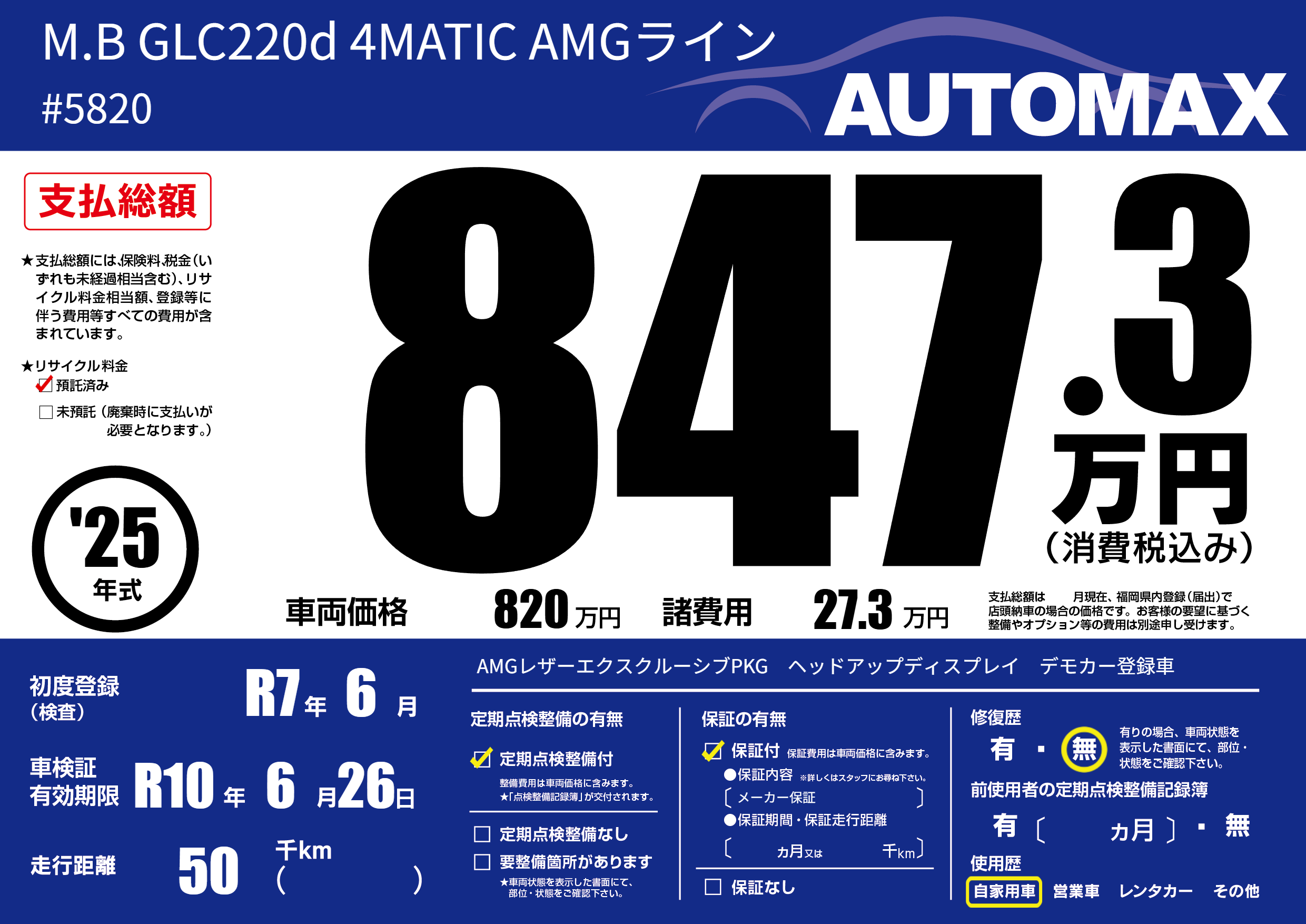 | 走行キロ | 5万km | 初年度登録 | R7年6月 |