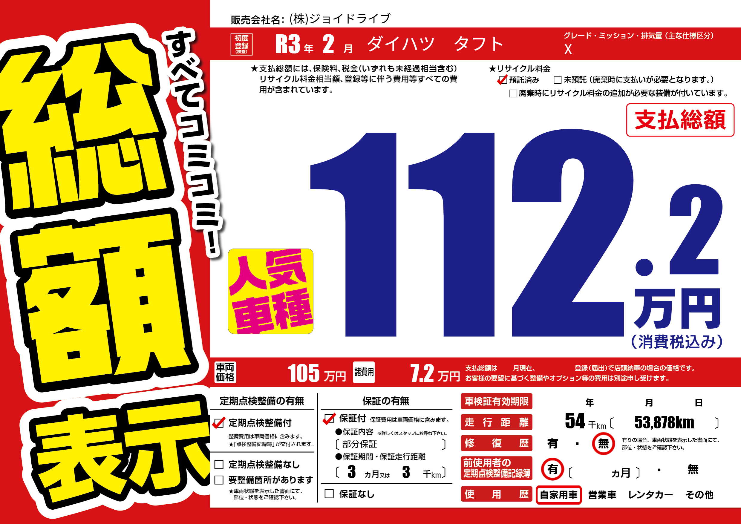 | 車名 | ダイハツ タフト | グレード ミッション 排気量 |