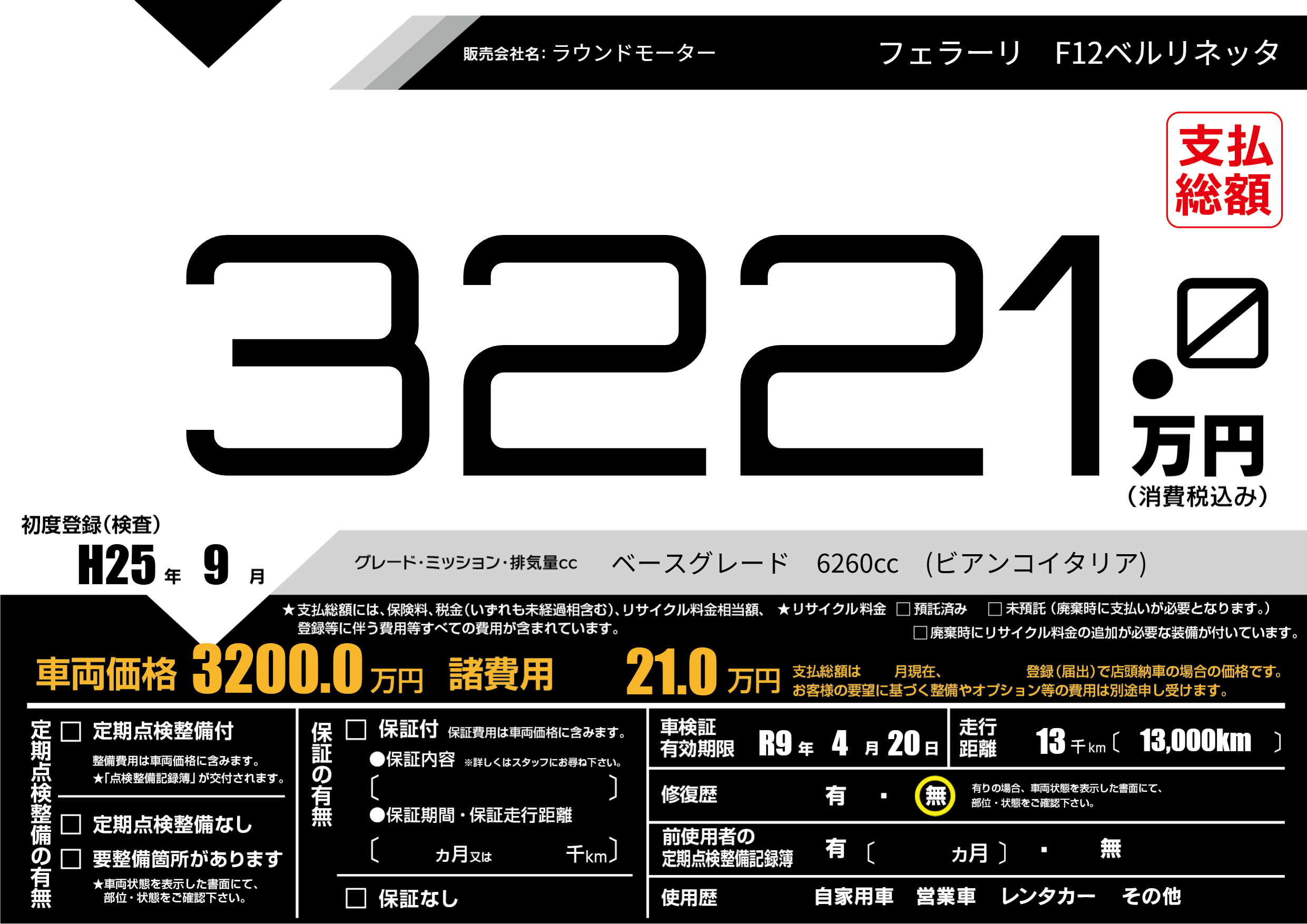 | 車名 | フェラーリ F12ベルリネッタ | グレード ミッション 排気量 |
