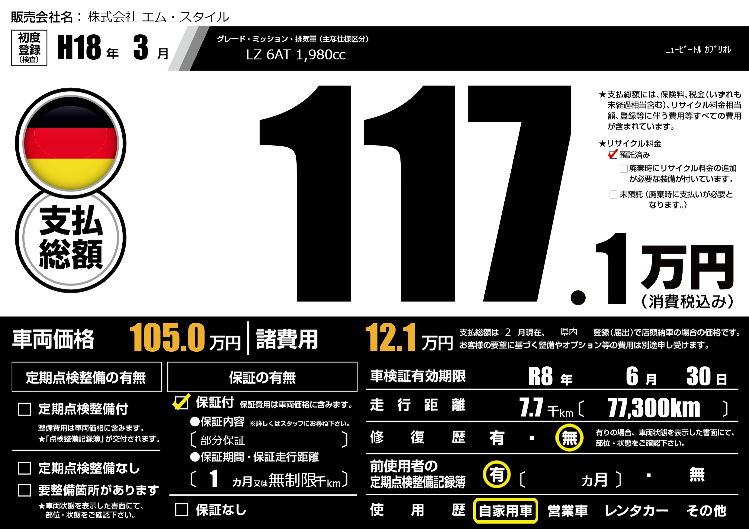 | 走行キロ | 0.7万km | 初年度登録 | H18年3月 |