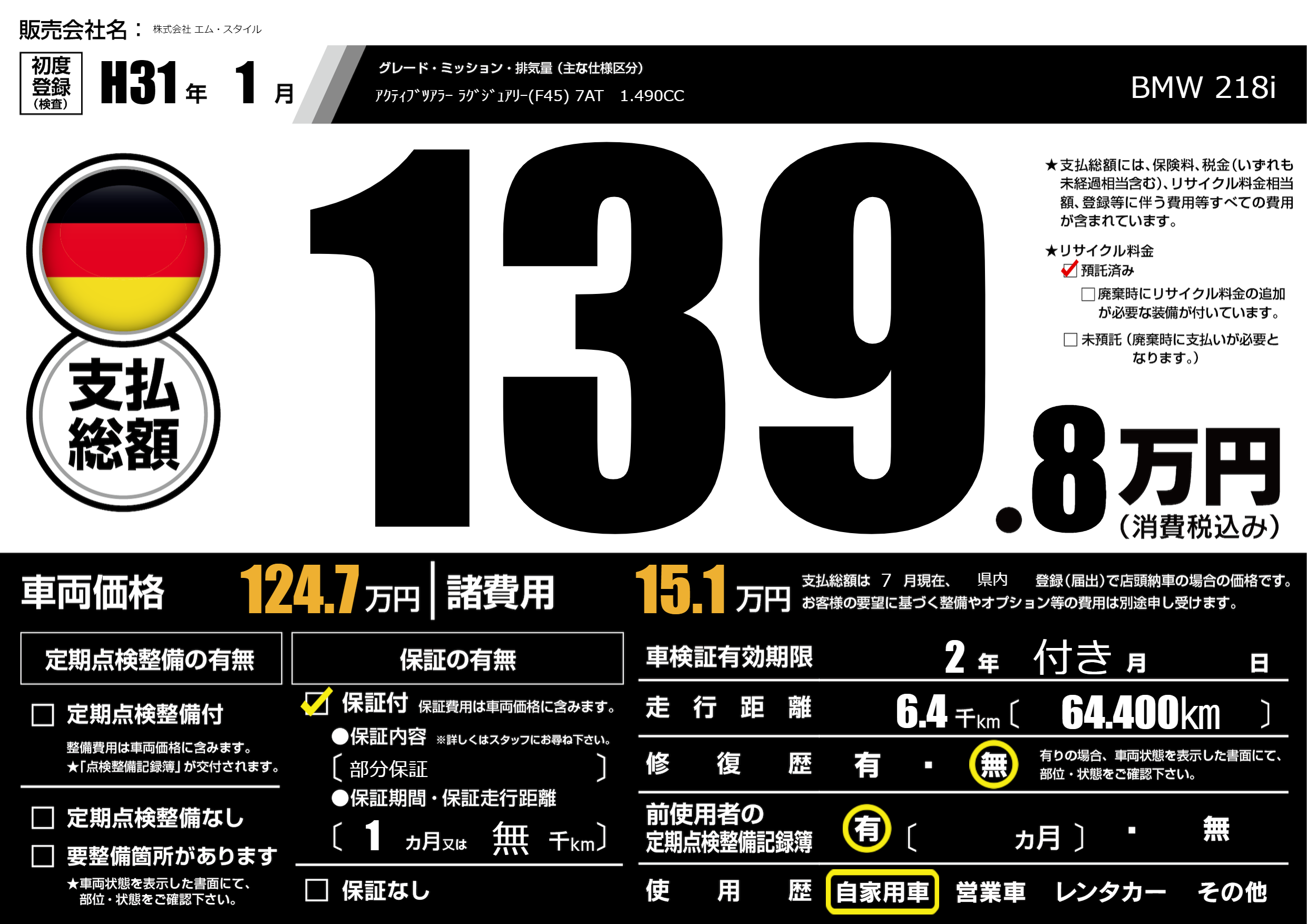 | 車名 | BMW 218i | グレード ミッション 排気量 |