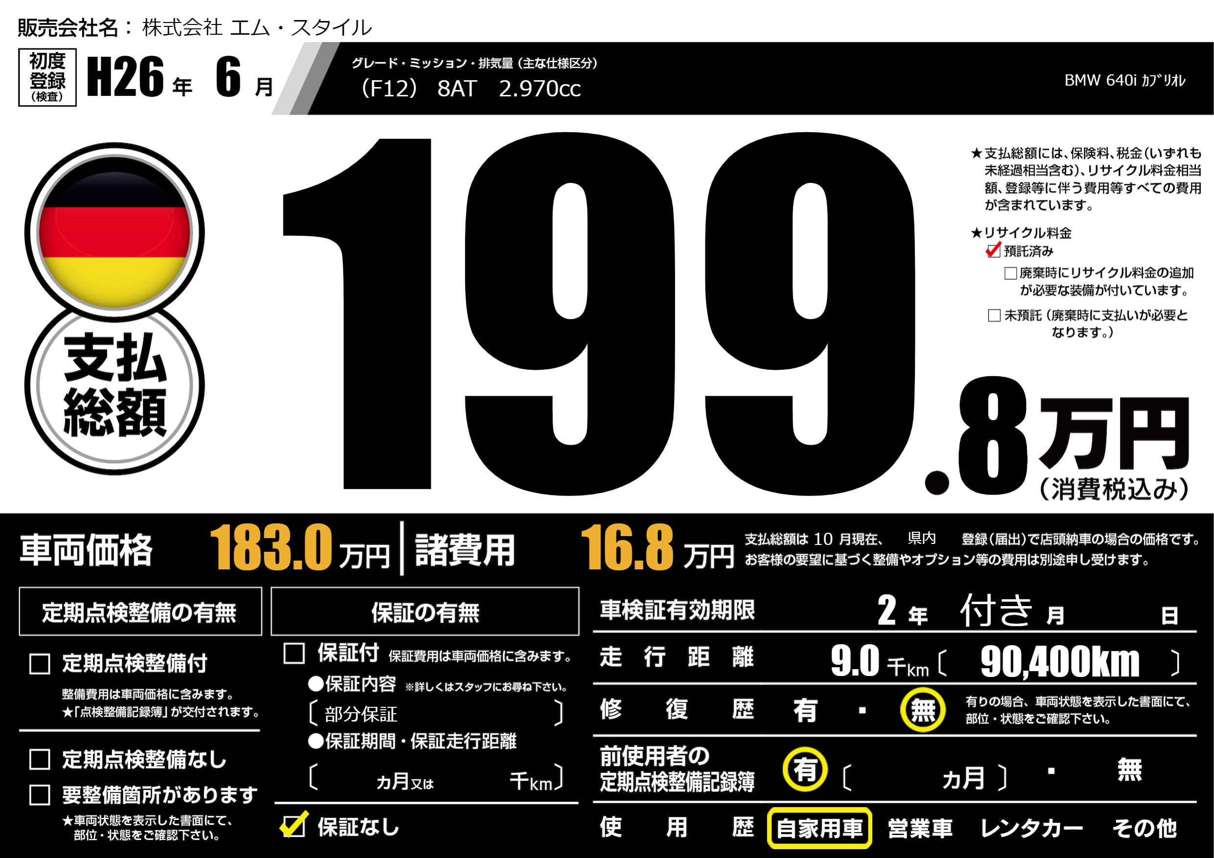 | 車名 | BMW 640i カブリオレ | グレード ミッション 排気量 |