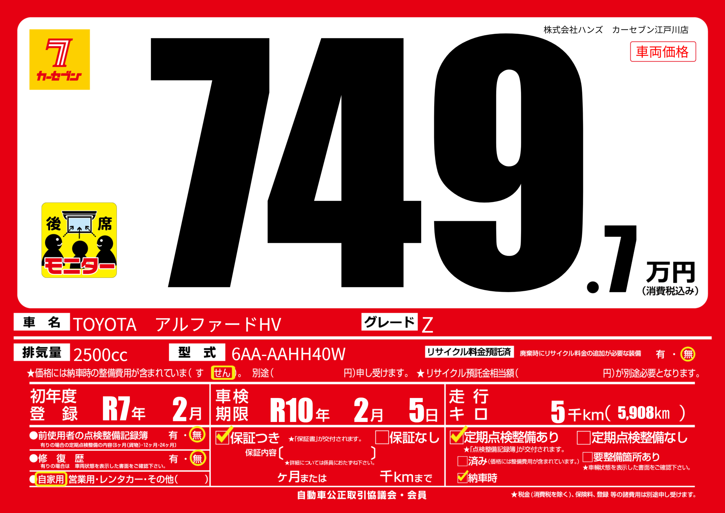 | 走行キロ | 0.5万km | 初年度登録 | R7年2月 |