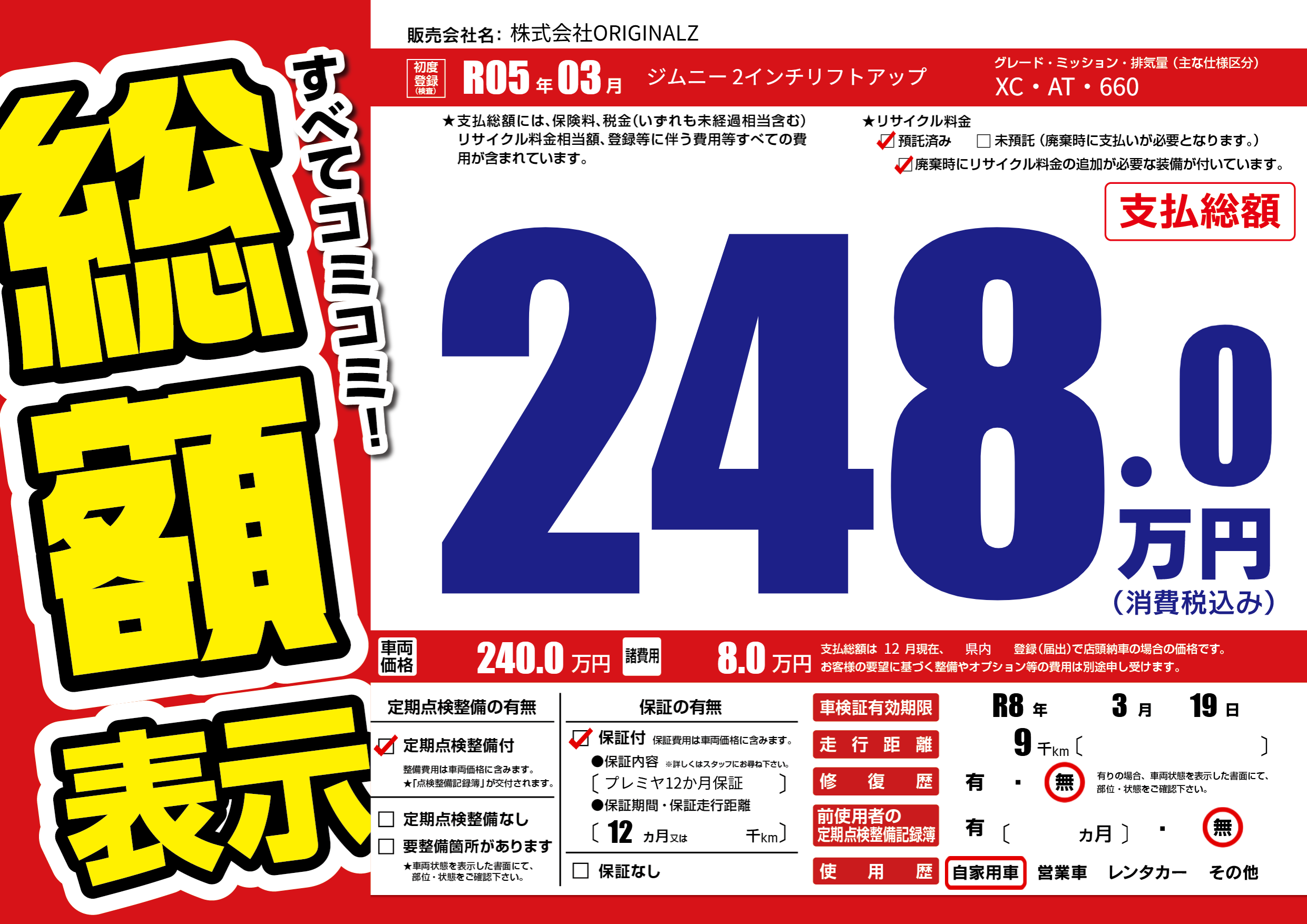 | 走行キロ | 0.9万km | 初年度登録 | R05年03月 |