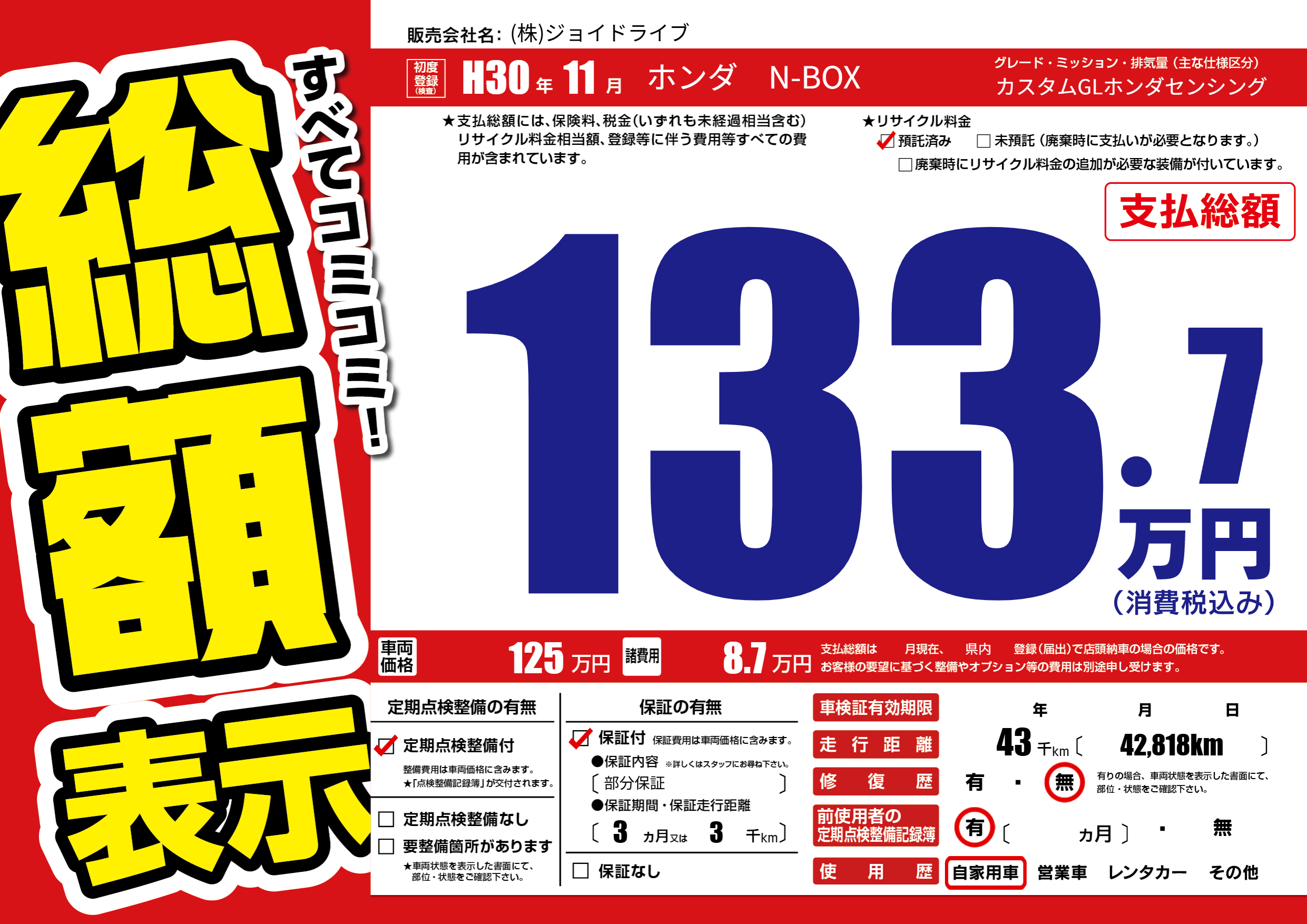 | 走行キロ | 4.3万km | 初年度登録 | H30年11月 |