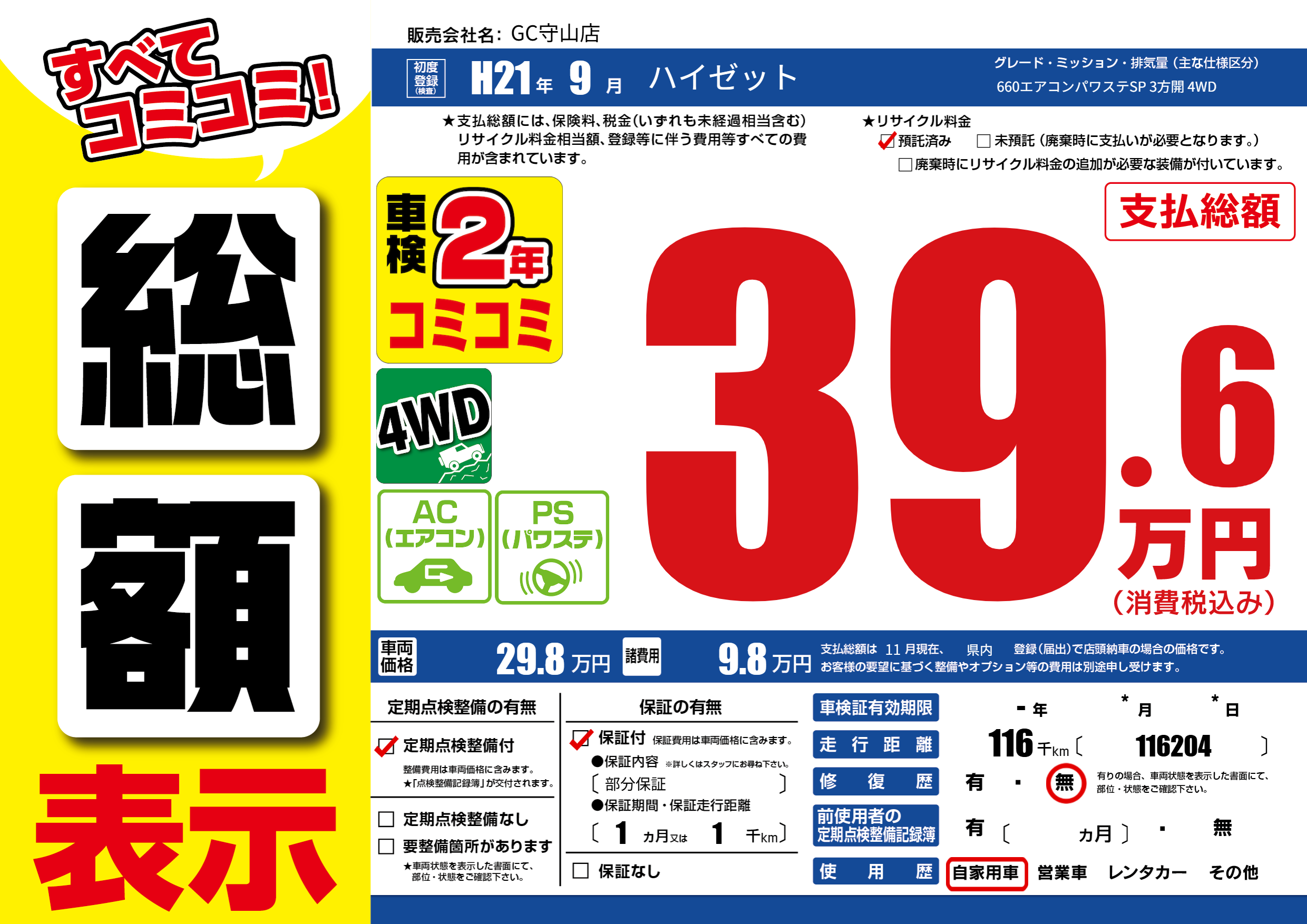 | 走行キロ | 11.6万km | 初年度登録 | H21年9月 |