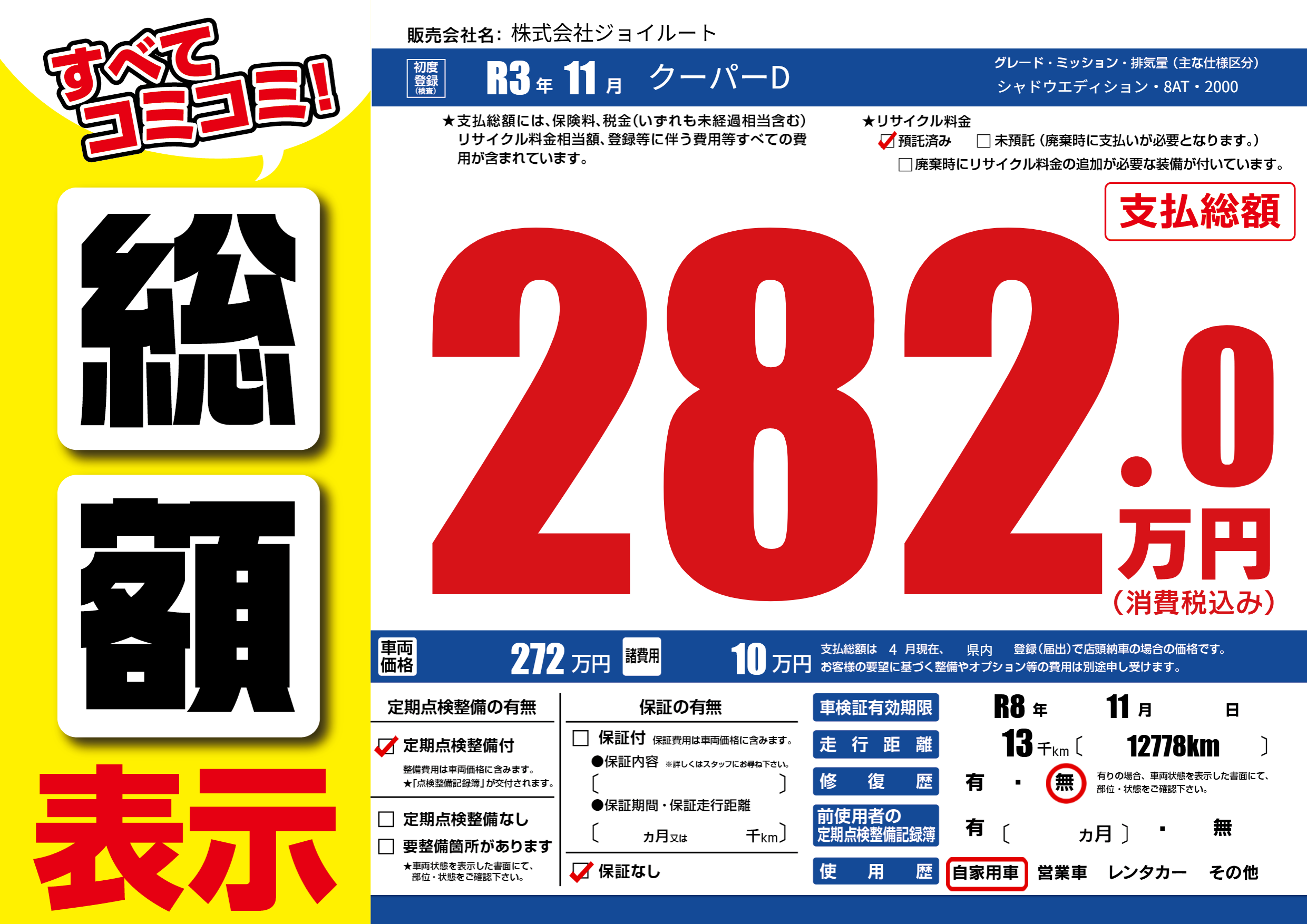 | 車名 | クーパーD | グレード ミッション 排気量 |