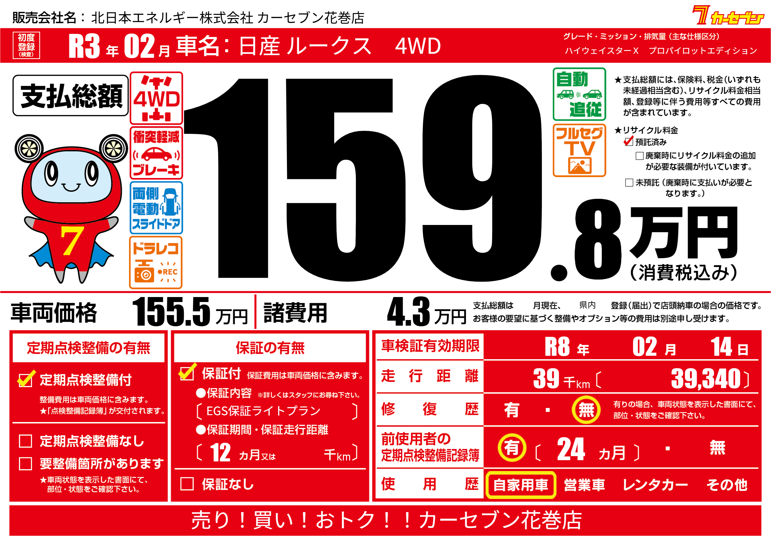 | 車名 | 日産 ルークス 4WD | グレード ミッション 排気量 |