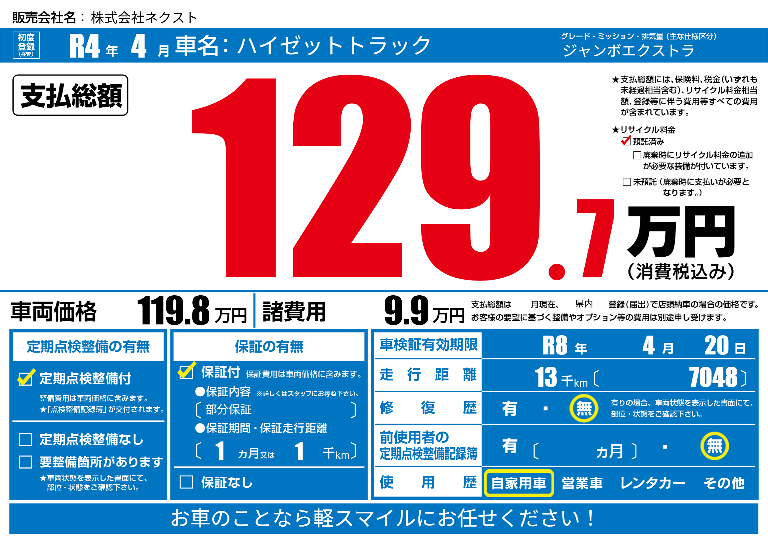 | 走行キロ | 1.3万km | 初年度登録 | R4年4月 |