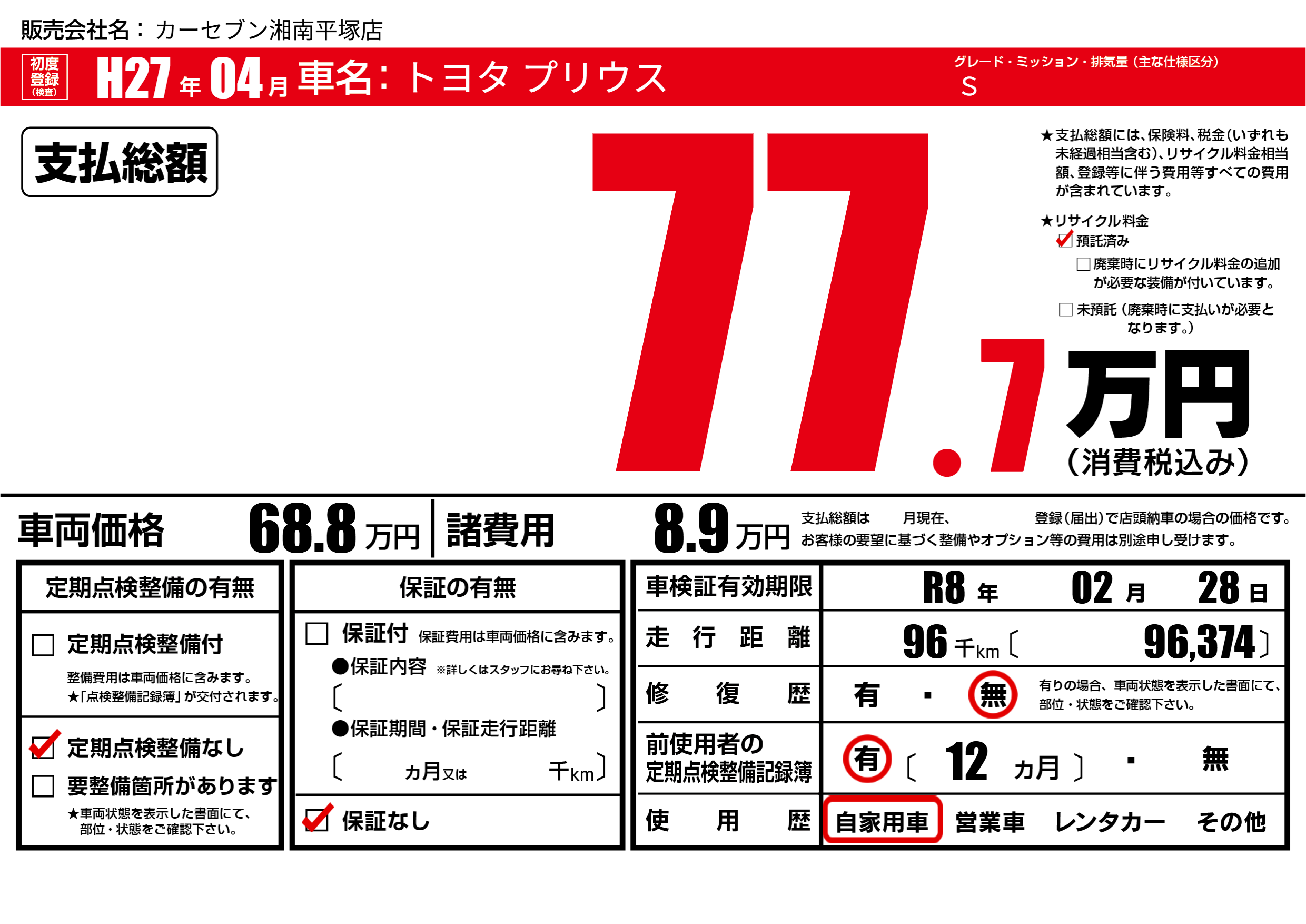 | 車名 | トヨタ プリウス | グレード ミッション 排気量 |