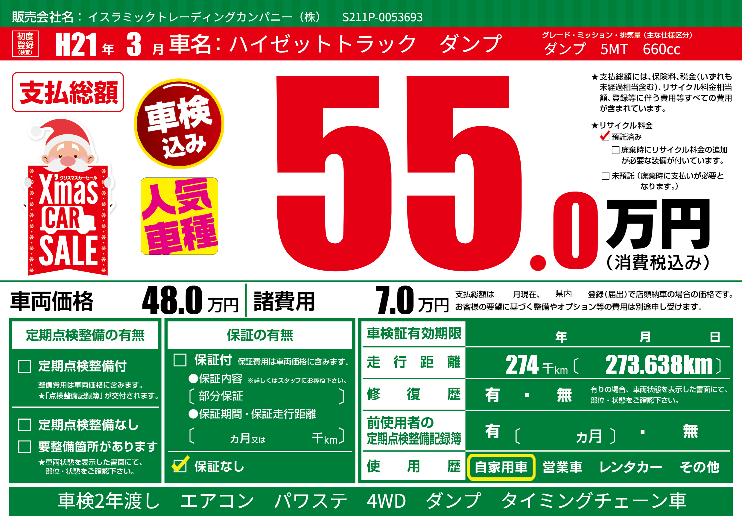 | 車名 | ハイゼットトラック ダンプ | グレード ミッション 排気量 |
