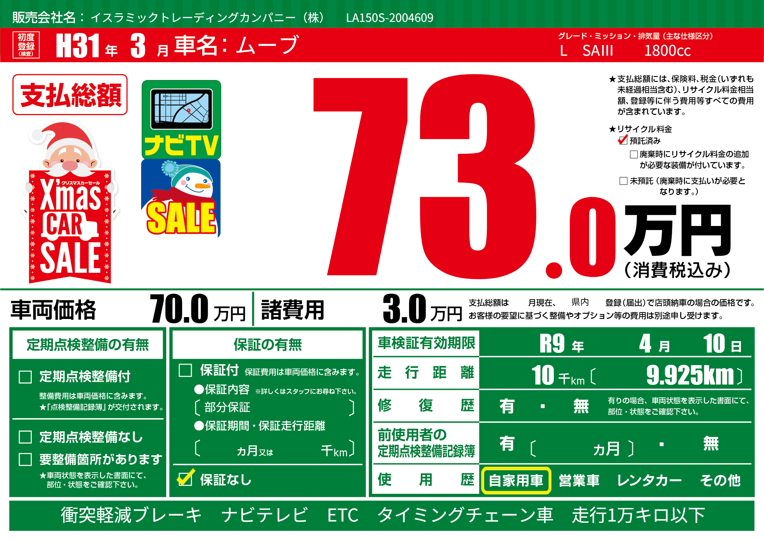 | 走行キロ | 1万km | 初年度登録 | H31年3月 |