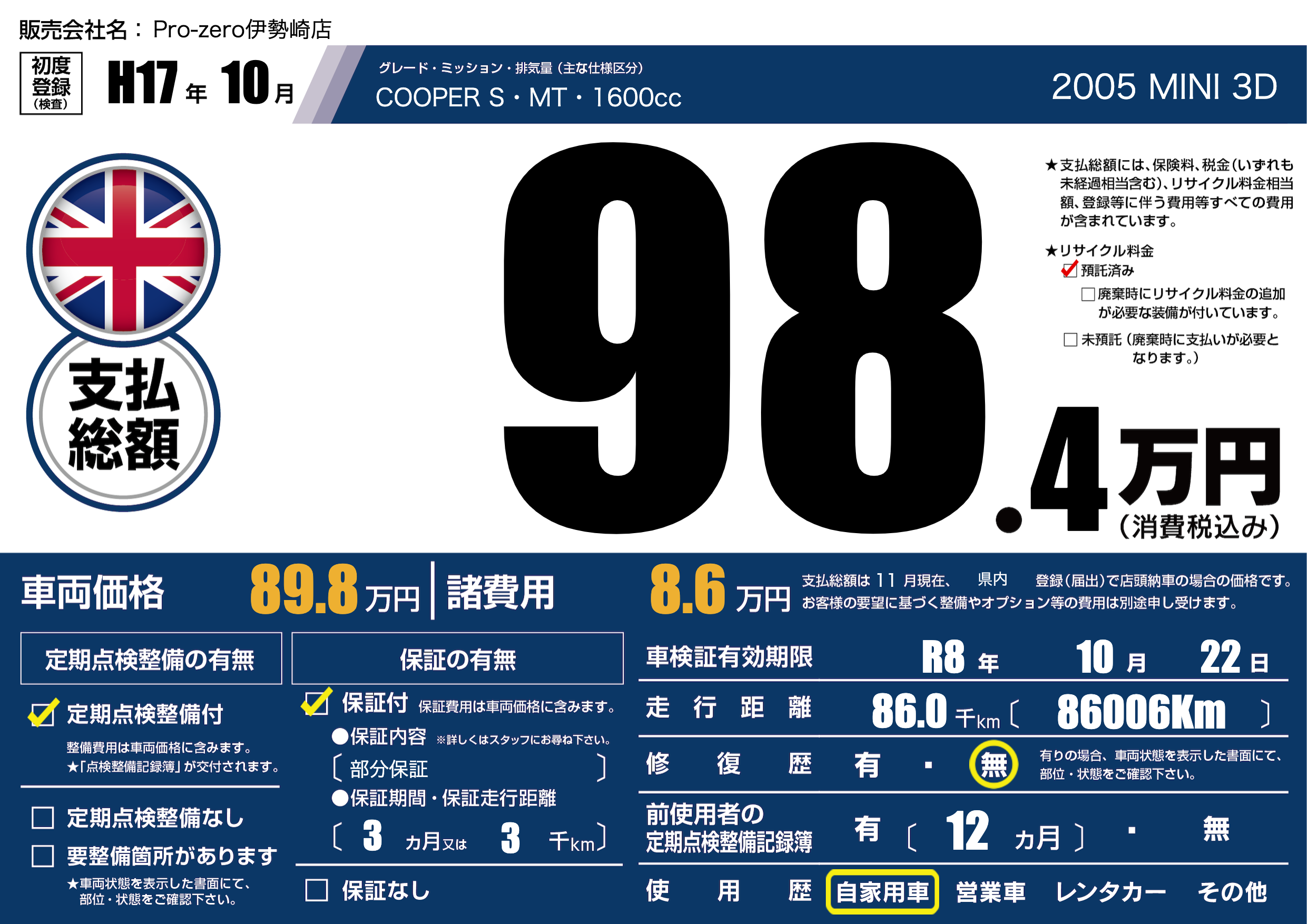 | 走行キロ | 8.6万km | 初年度登録 | H17年10月 |