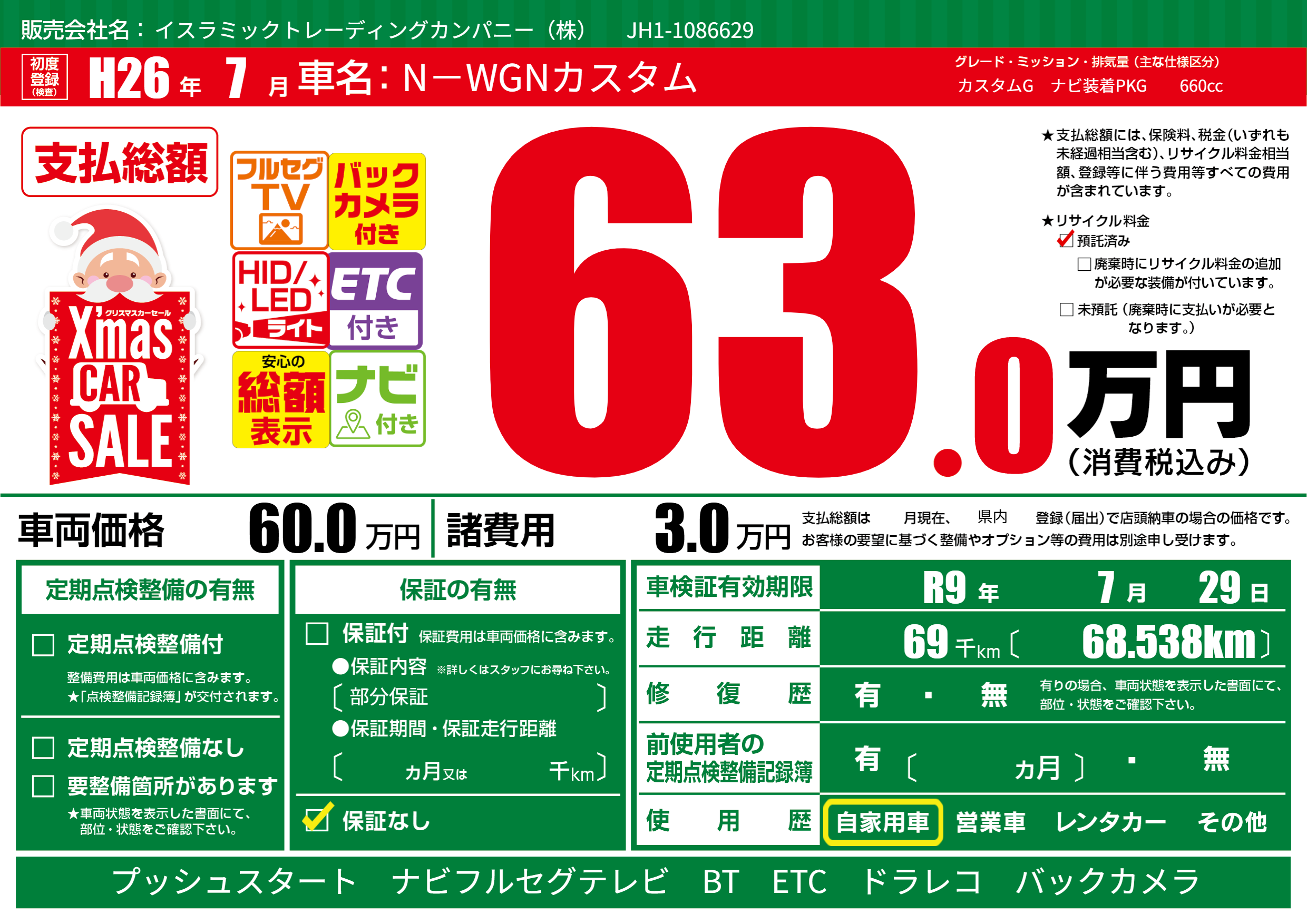 | 車名 | N-WGNカスタム | グレード ミッション 排気量 |