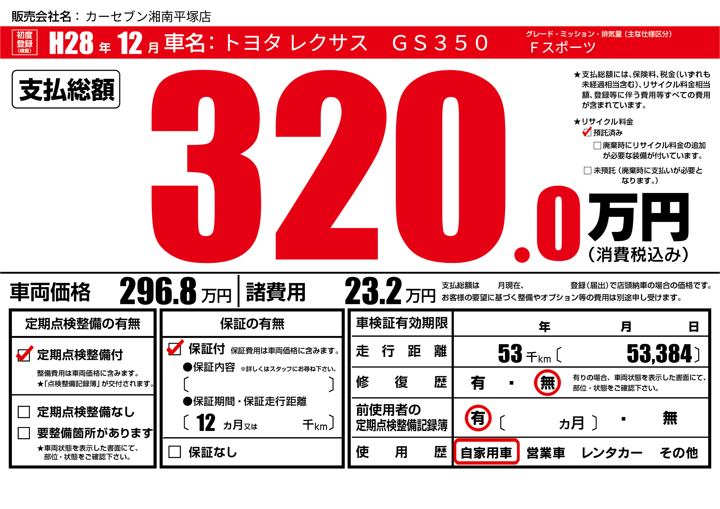 | 車名 | トヨタ レクサス GS350 | グレード ミッション 排気量 |