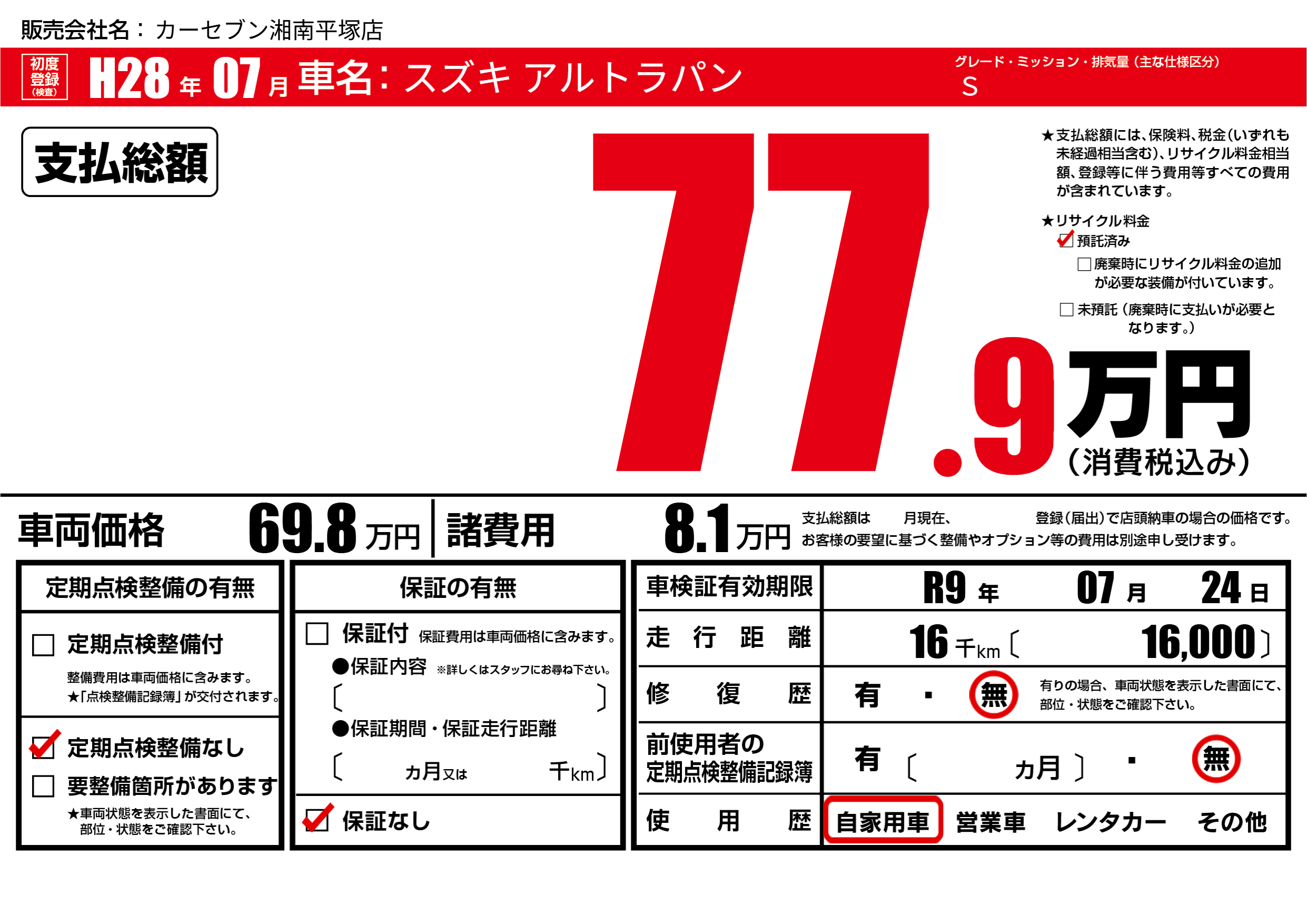 | 走行キロ | 1.6万km | 初年度登録 | H28年07月 |
