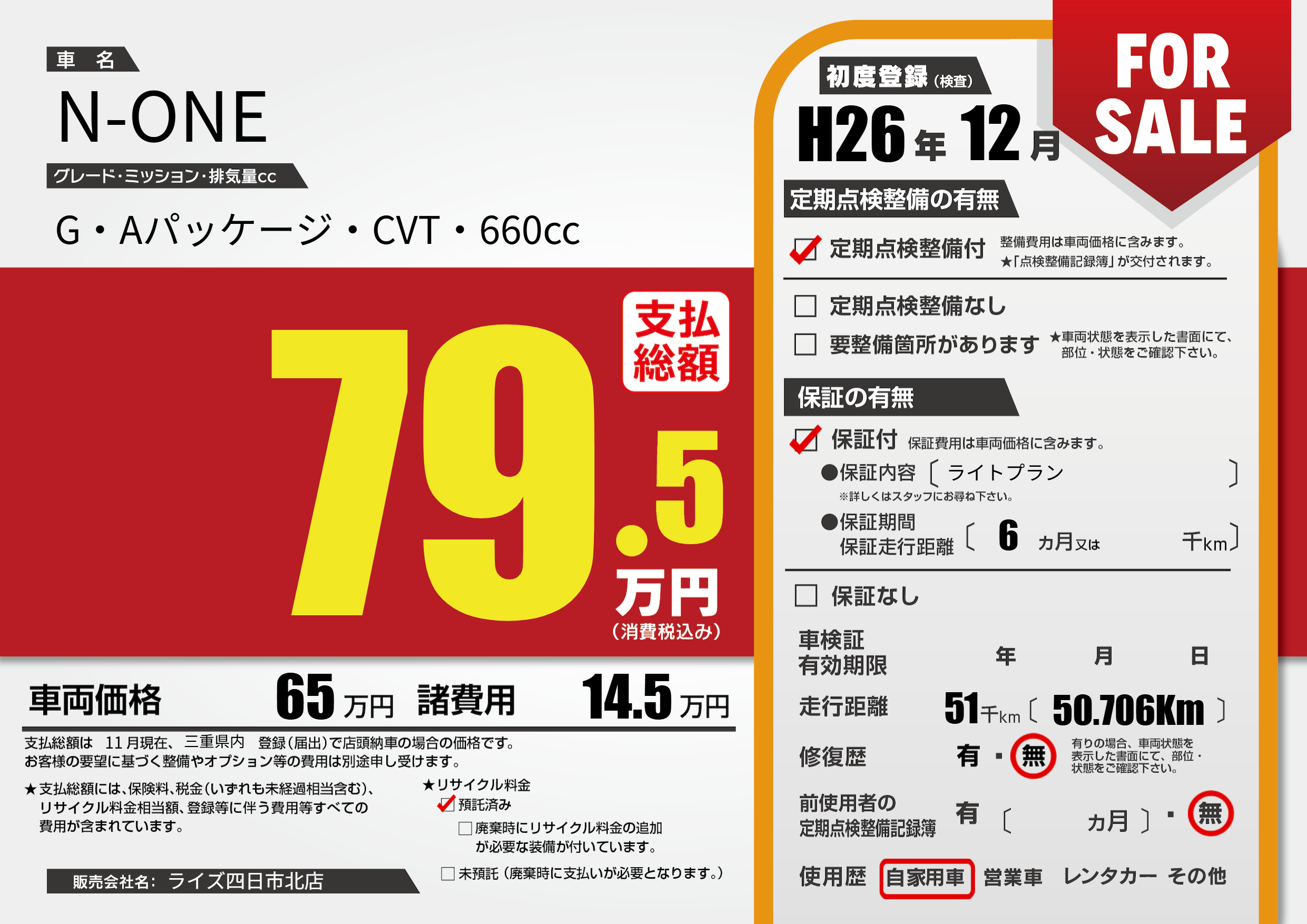 | 車名 | N-ONE | グレード ミッション 排気量 |