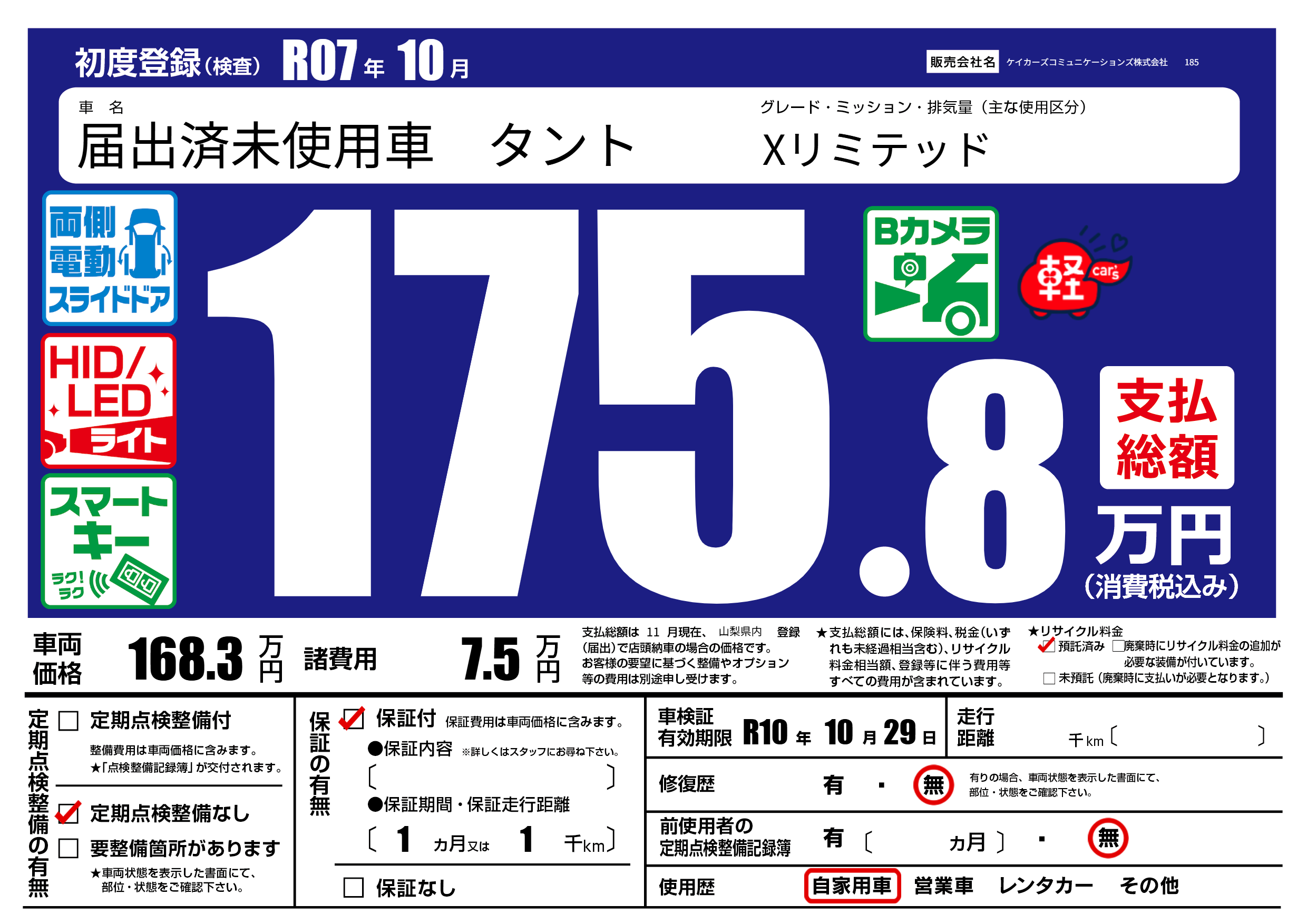 | 走行キロ | - | 初年度登録 | R07年10月 |