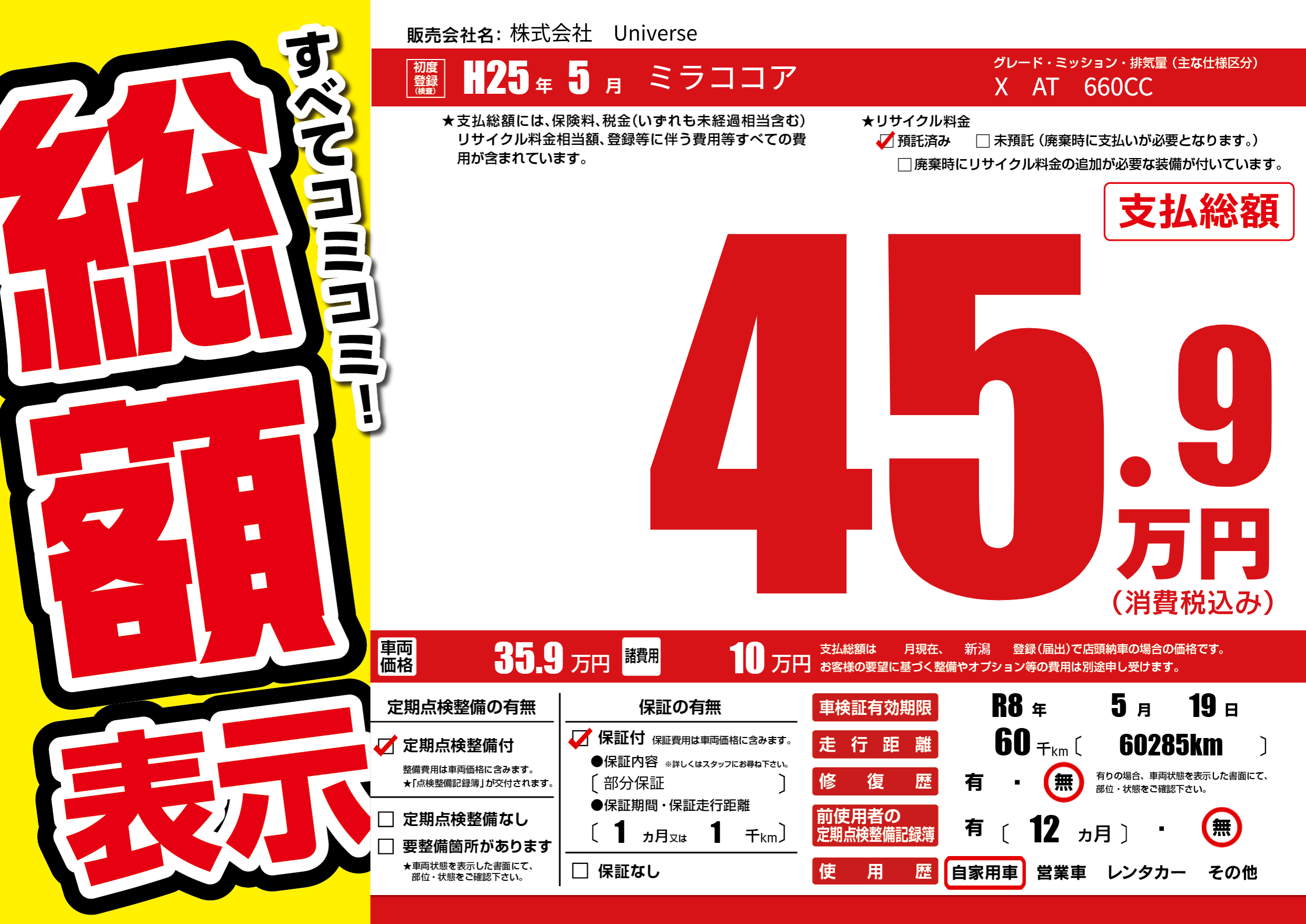 | 走行キロ | 6万km | 初年度登録 | H25年5月 |