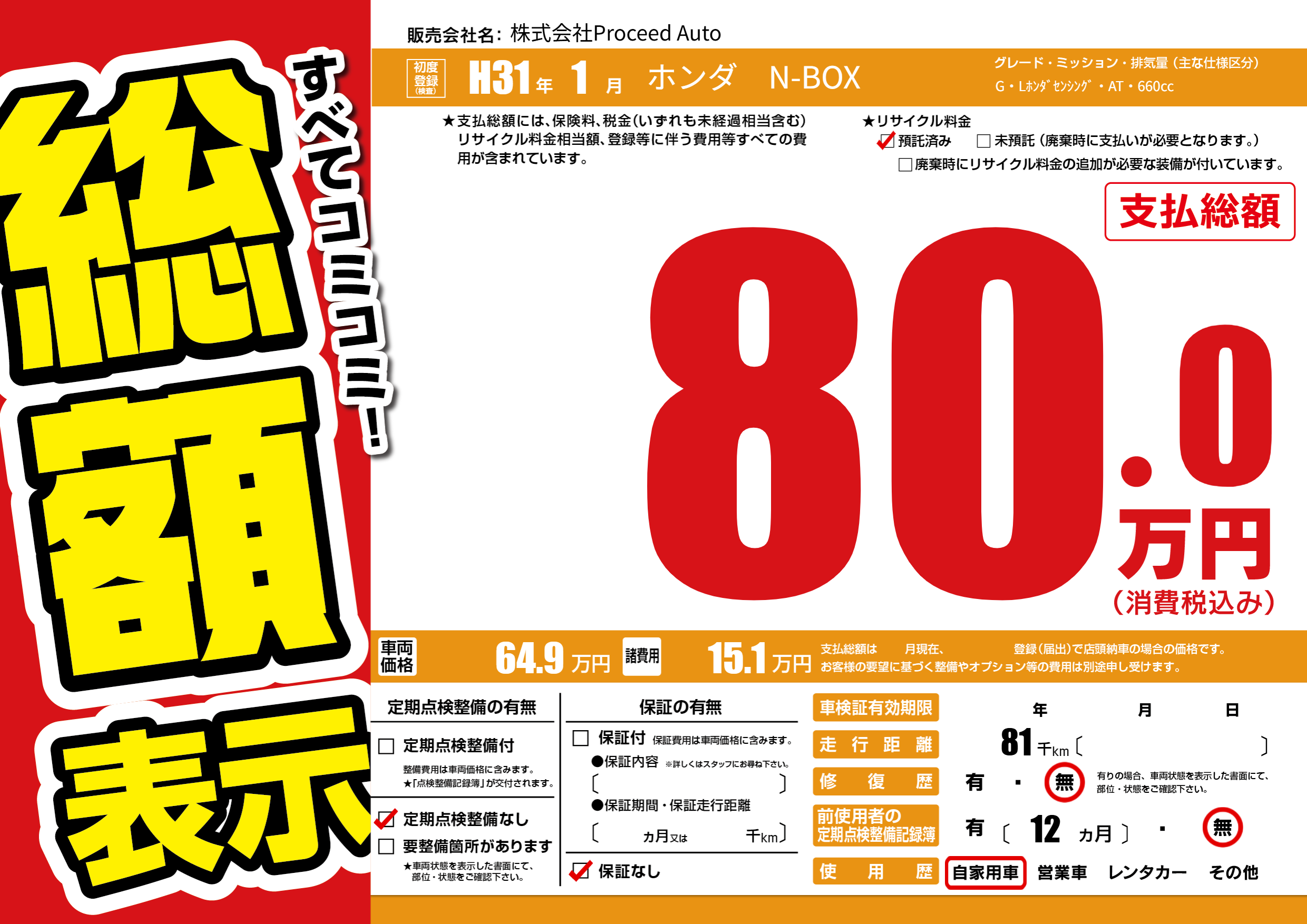 | 車名 | ホンダ N-BOX | グレード ミッション 排気量 |