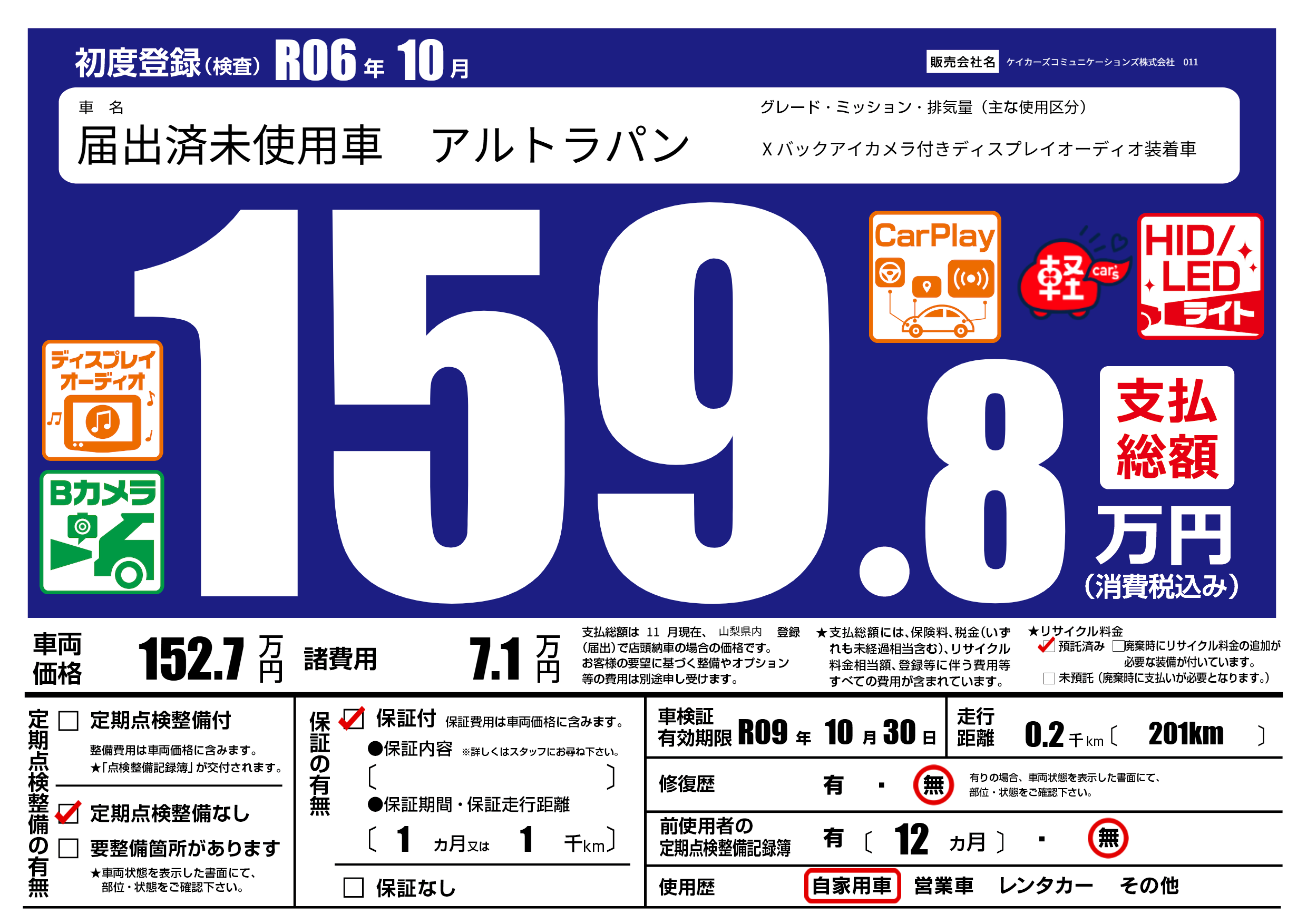 | 走行キロ | - | 初年度登録 | R06年10月 |