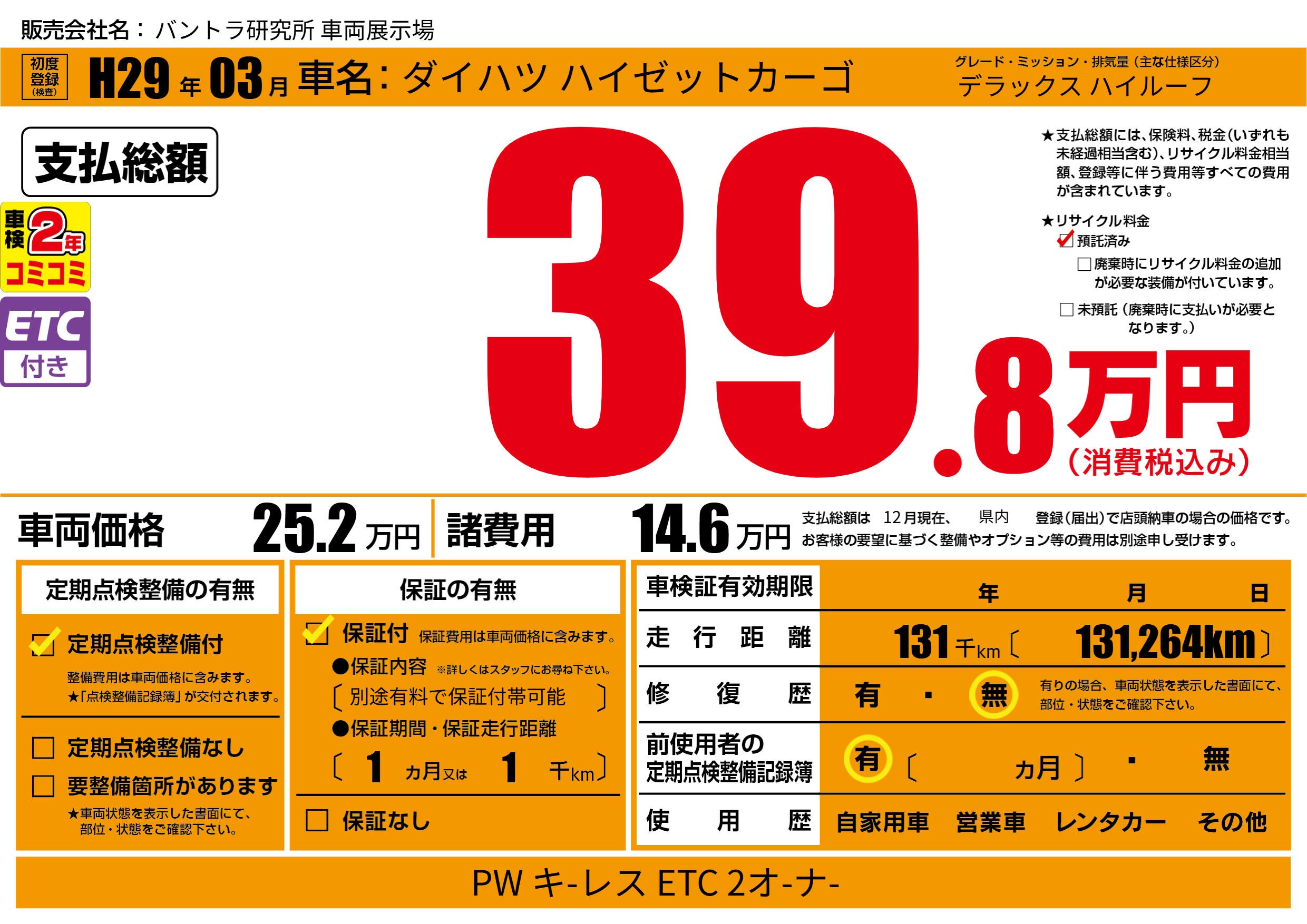 | 車名 | ダイハツ ハイゼットカーゴ | グレード ミッション 排気量 |