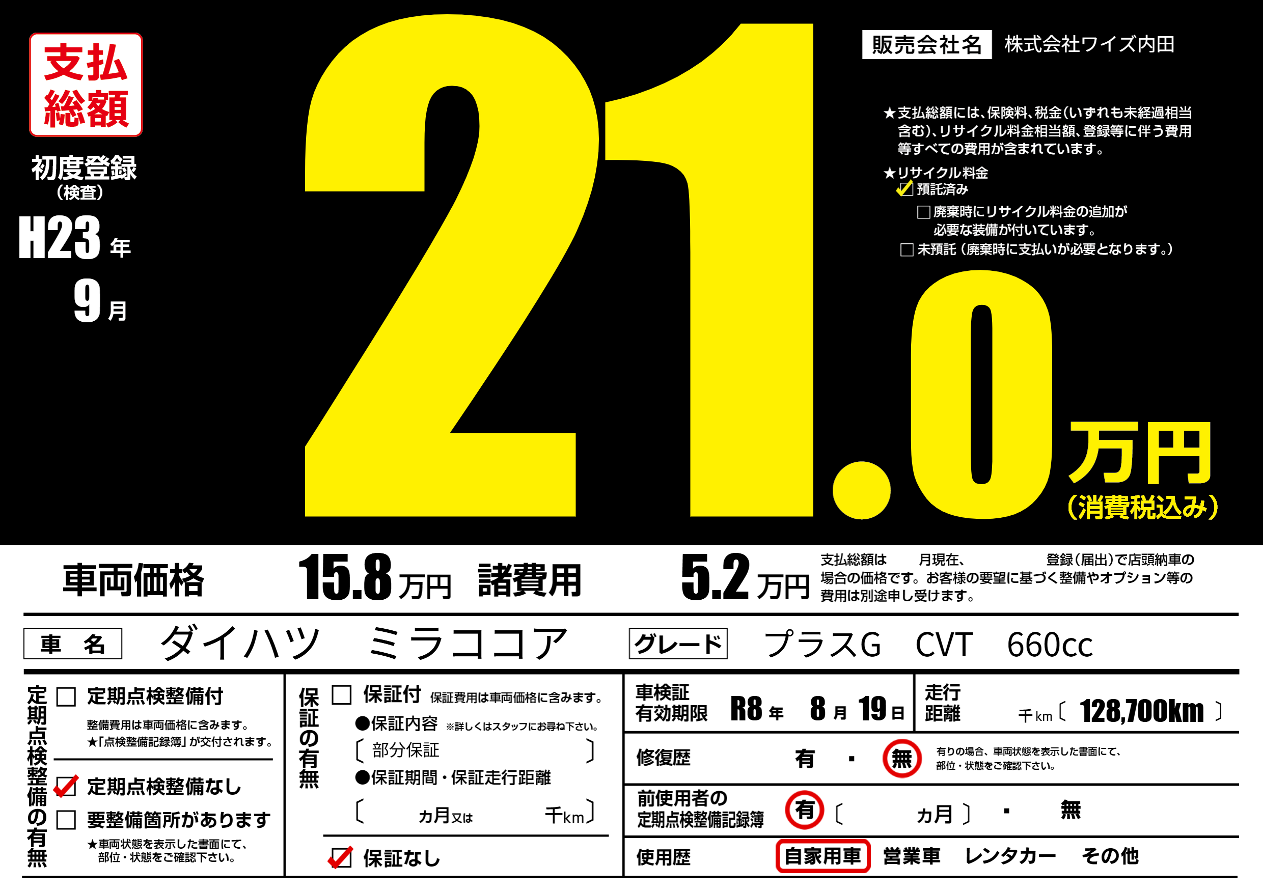 | 車検制限 | R8年 8月 19日 | ||
