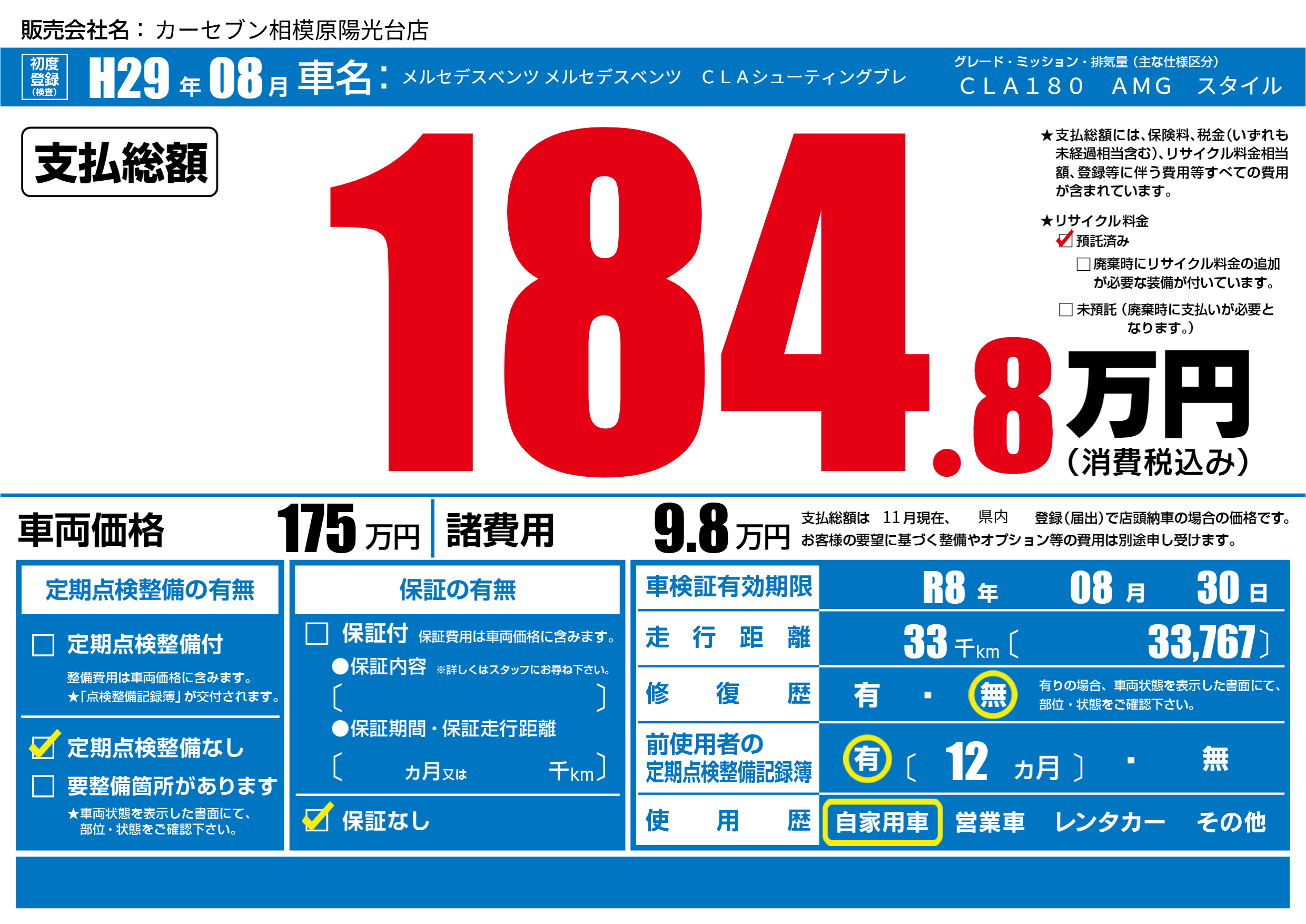 | 車名 | メルセデスベンツ メルセデスベンツ CLAシューティングブレ | グレード ミッション 排気量 |