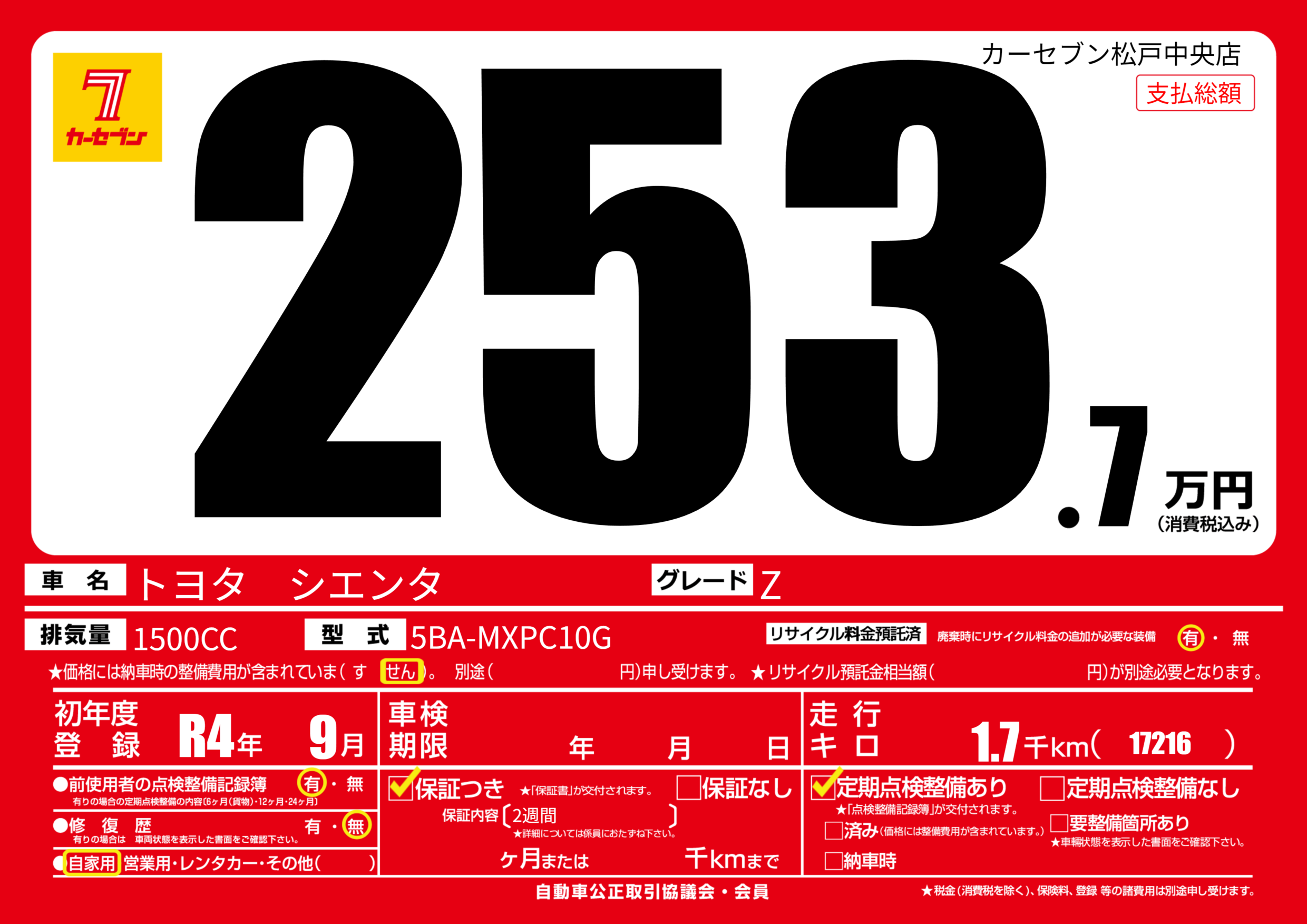 | 車名 | トヨタ シエンタ | グレード ミッション 排気量 |