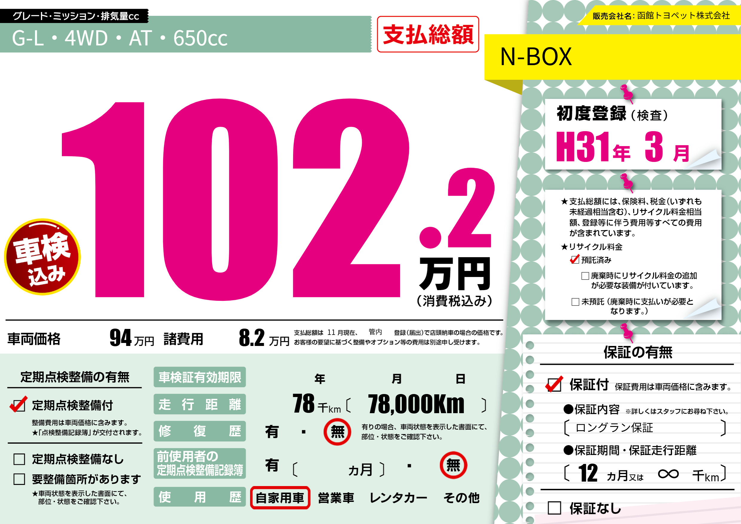 | 車名 | N-BOX | グレード ミッション 排気量 |