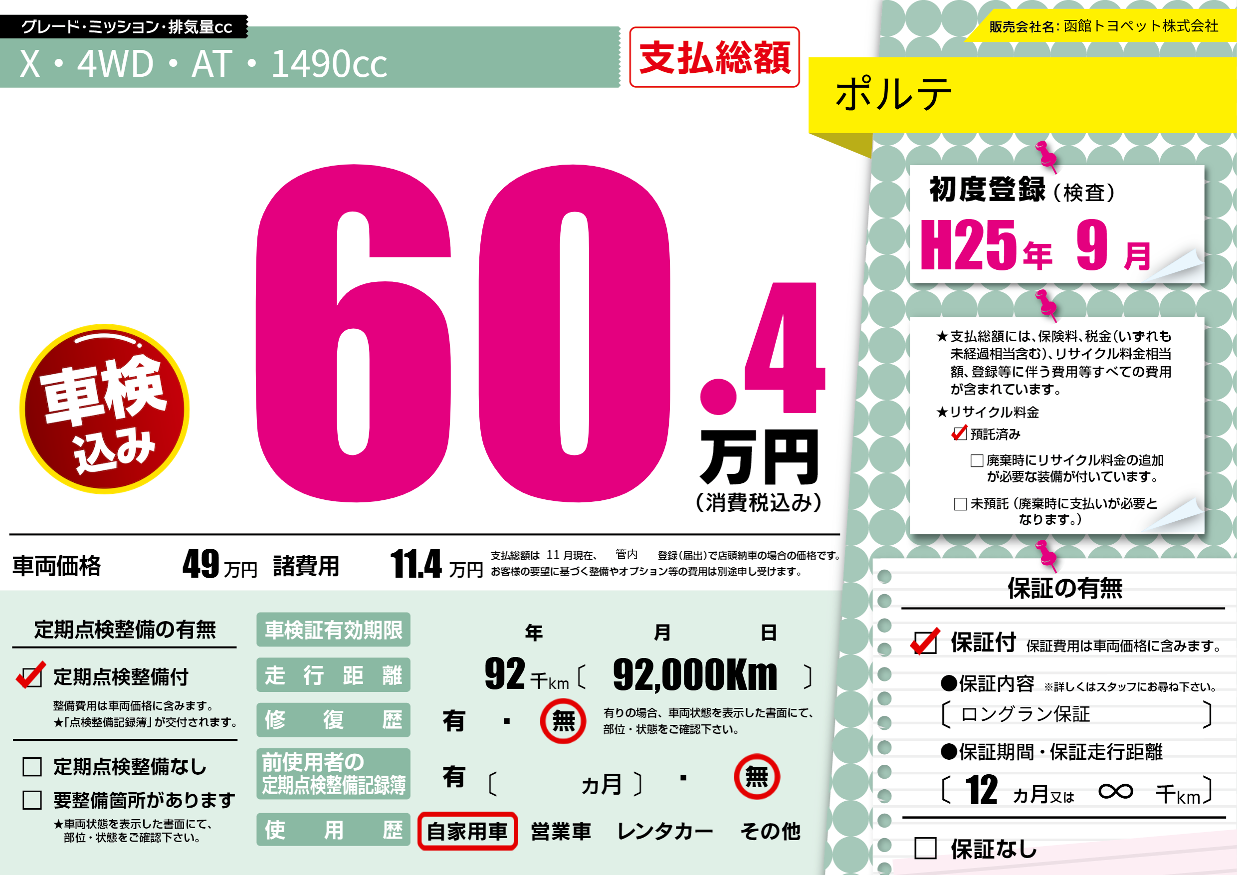 | 車名 | ポルテ | グレード ミッション 排気量 |