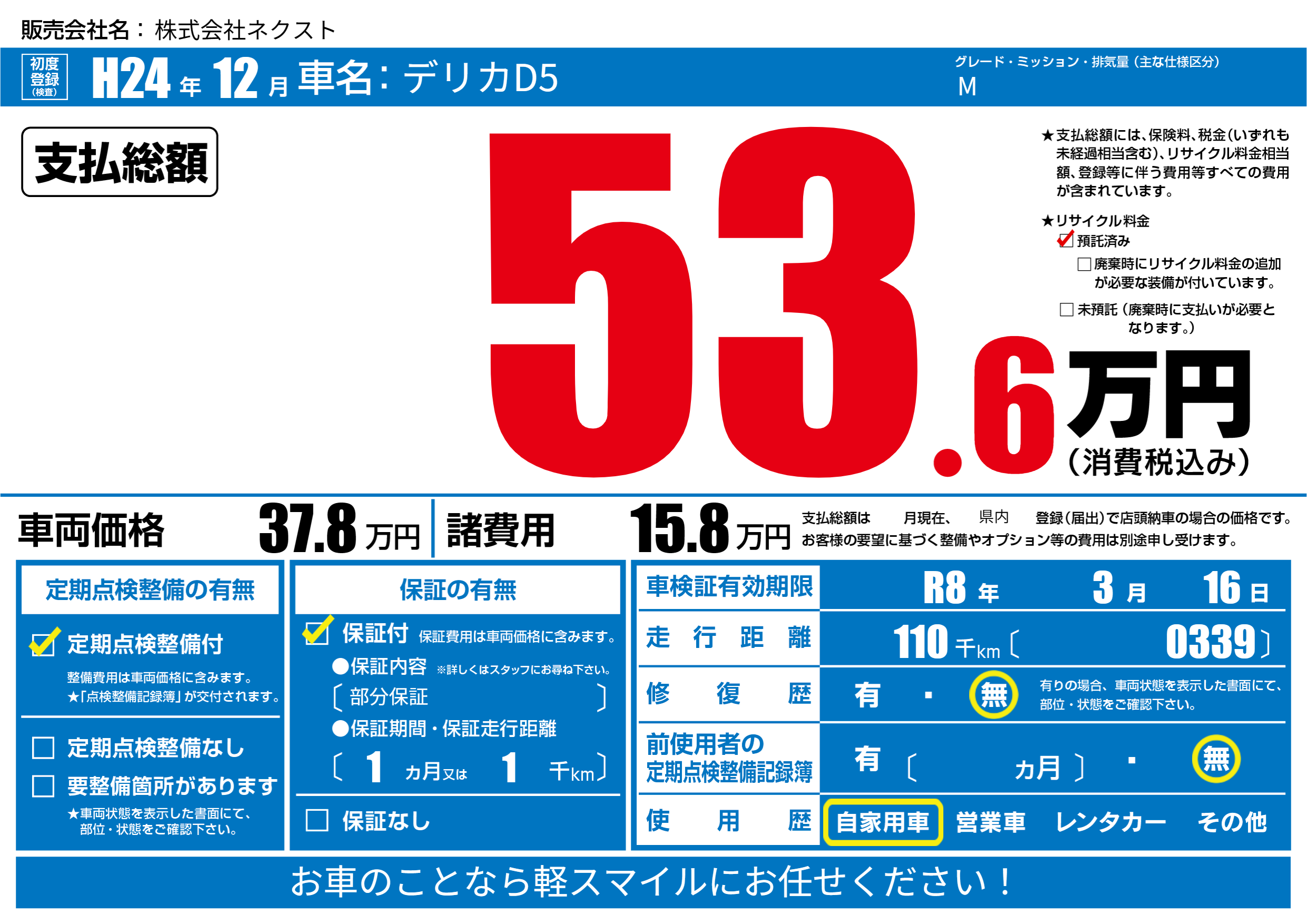 | 車名 | デリカD5 | グレード ミッション 排気量 |