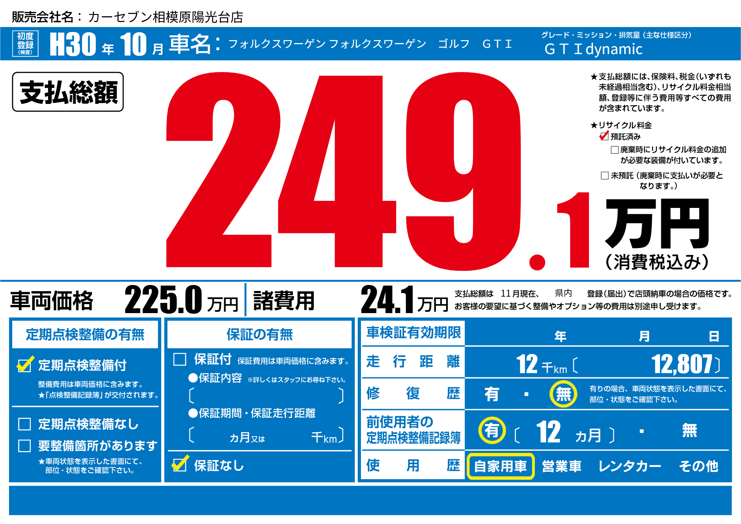 | 車名 | フォルクスワーゲン フォルクスワーゲン ゴルフ GTI | グレード ミッション 排気量 |